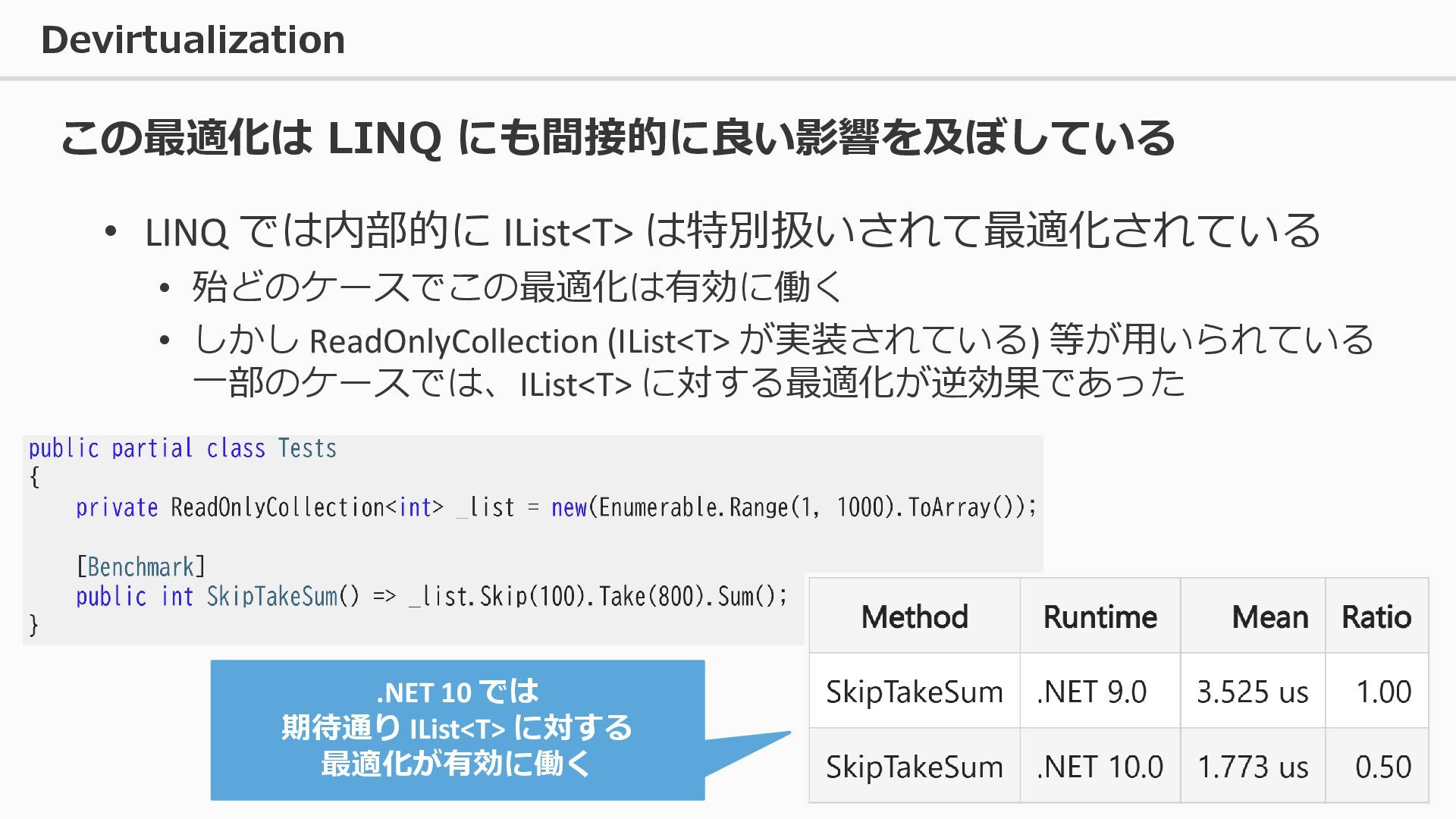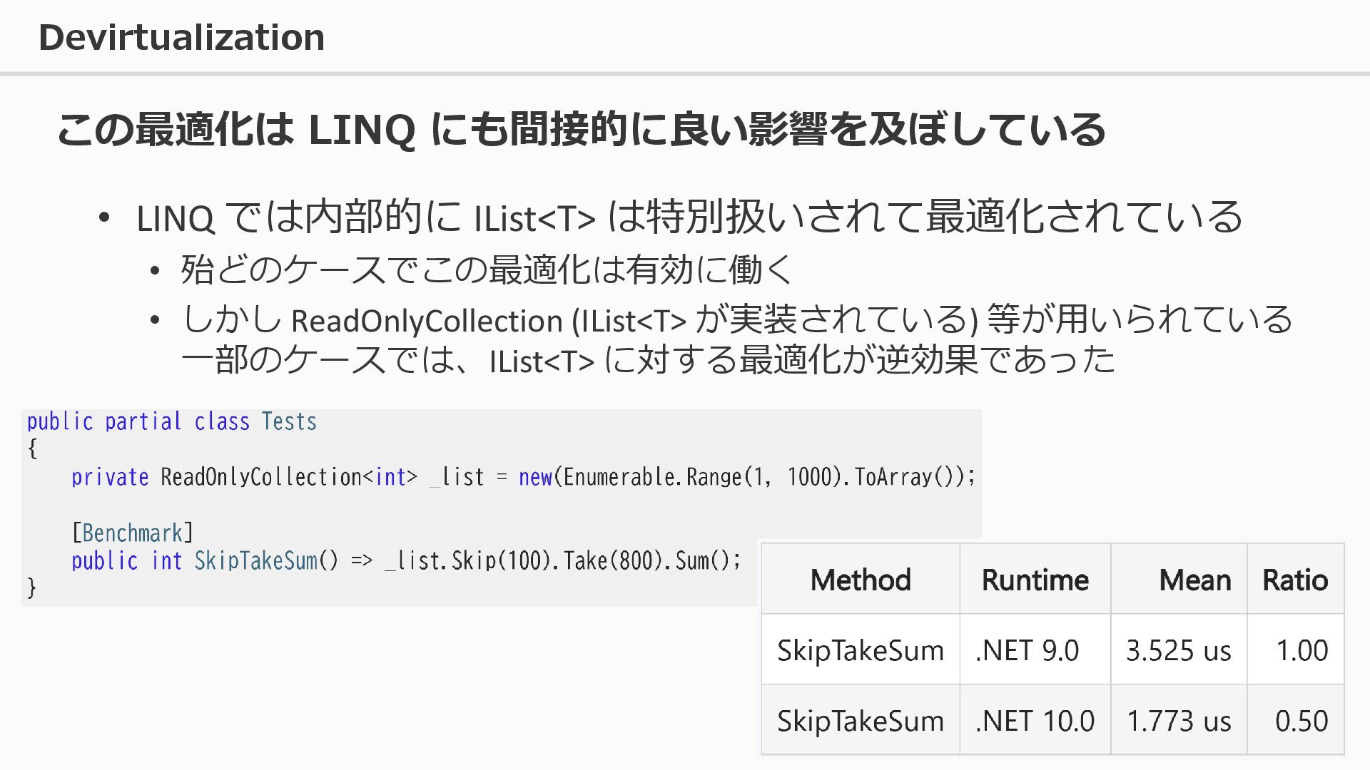 • 殆どのケースでこの最適化は有効に働く • しかし ReadOnlyCollection (IList<T> が実装されている) 等が用いられている 一部のケースでは、IList<T> に対する最適化が逆効果であった .NET 10 では 期待通り IList<T> に対する 最適化が有効に働く