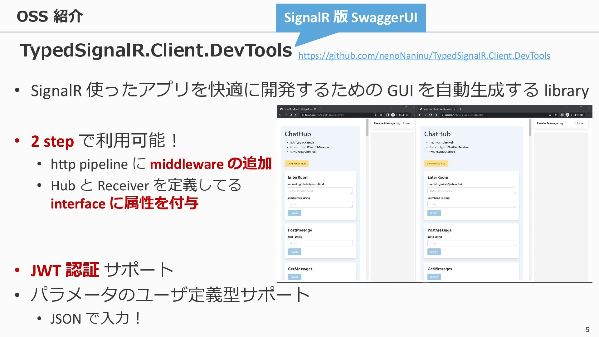 で利用可能! • http pipeline に middleware の追加 • Hub と Receiver を定義してる interface に属性を付与 • JWT 認証 サポート • パラメータのユーザ定義型サポート • JSON で入力! SignalR 版 SwaggerUI TypedSignalR.Client.DevTools https://github.com/nenoNaninu/TypedSignalR.Client.DevTools OSS 紹介