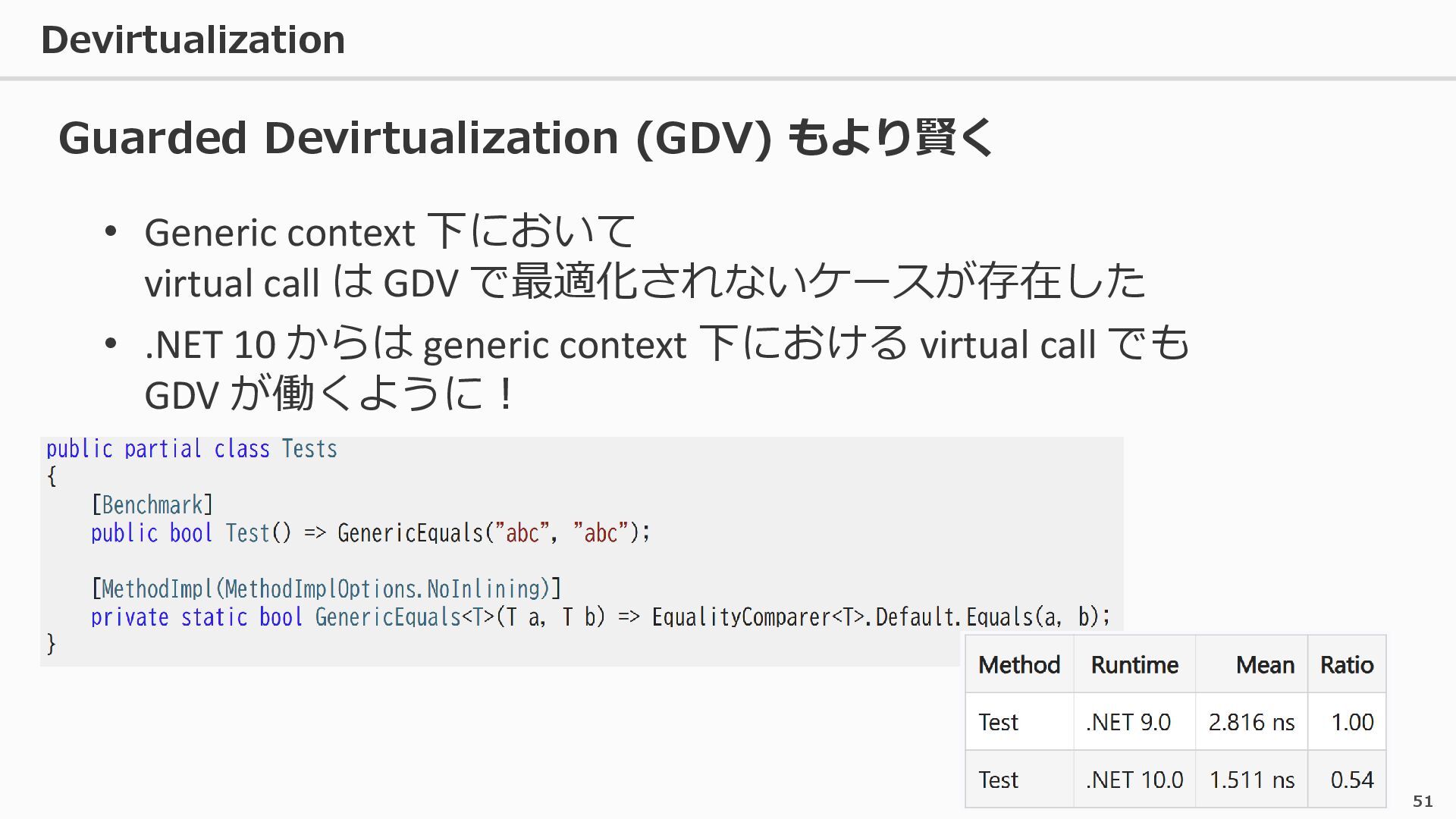 virtual call は GDV で最適化されないケースが存在した • .NET 10 からは generic context 下における virtual call でも GDV が働くように!