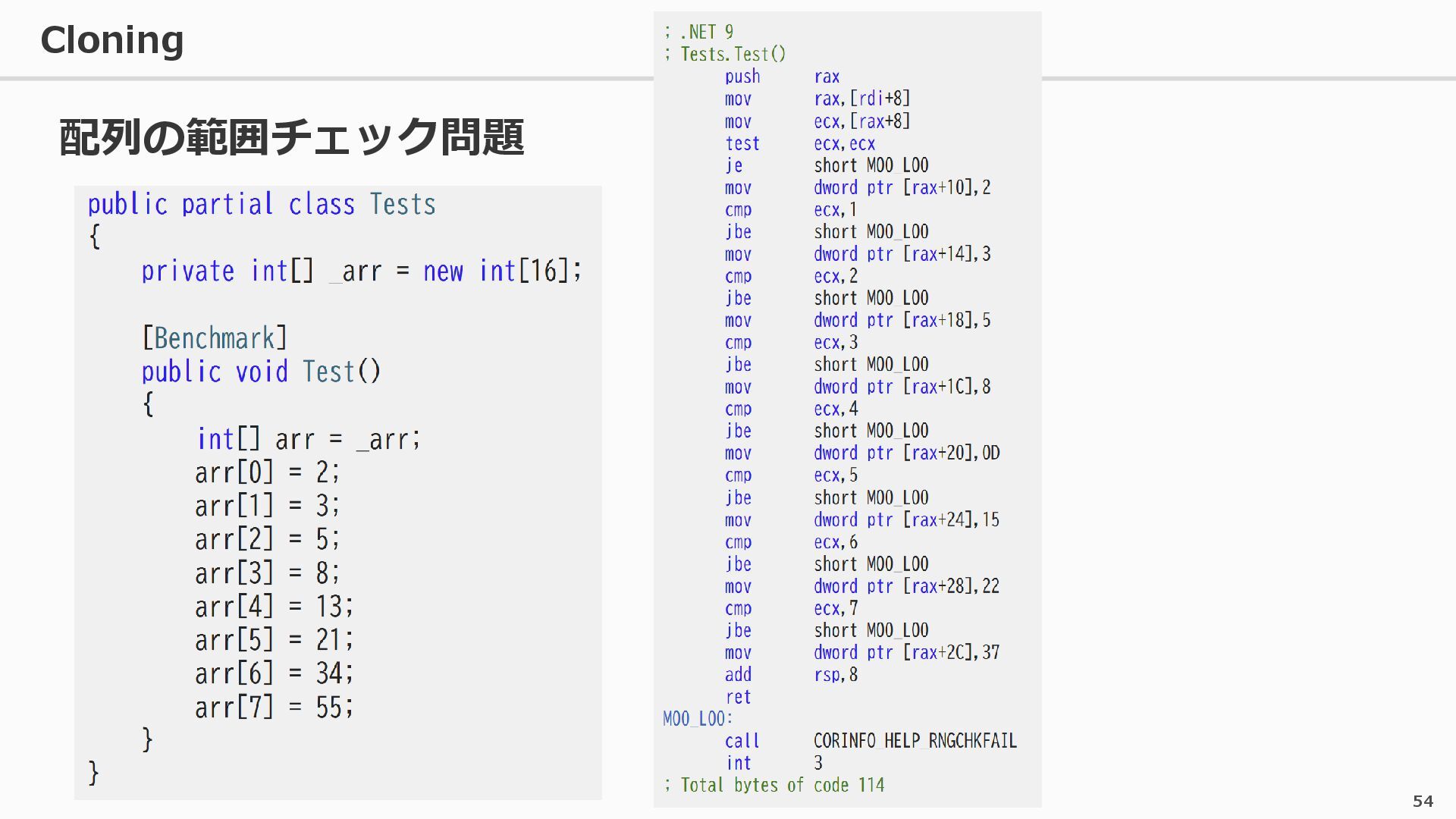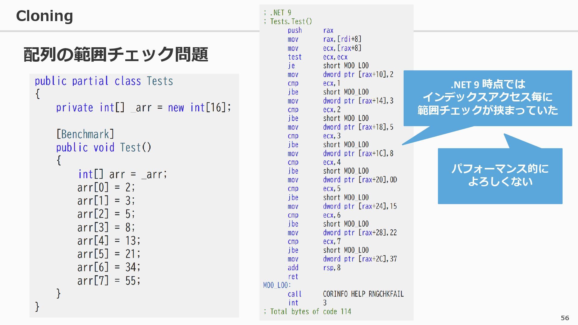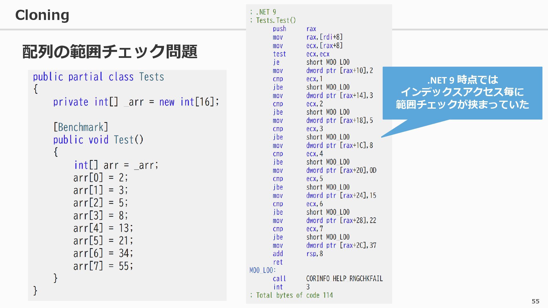 は span/arr と無関係なので 範囲チェックが必要 Span かつ .NET 9 の場合 毎回範囲チェック Array の場合は Cloning で範囲チェックが 外れた asm が生成