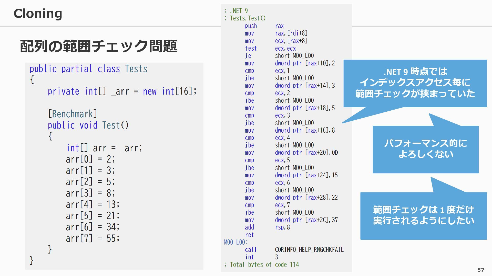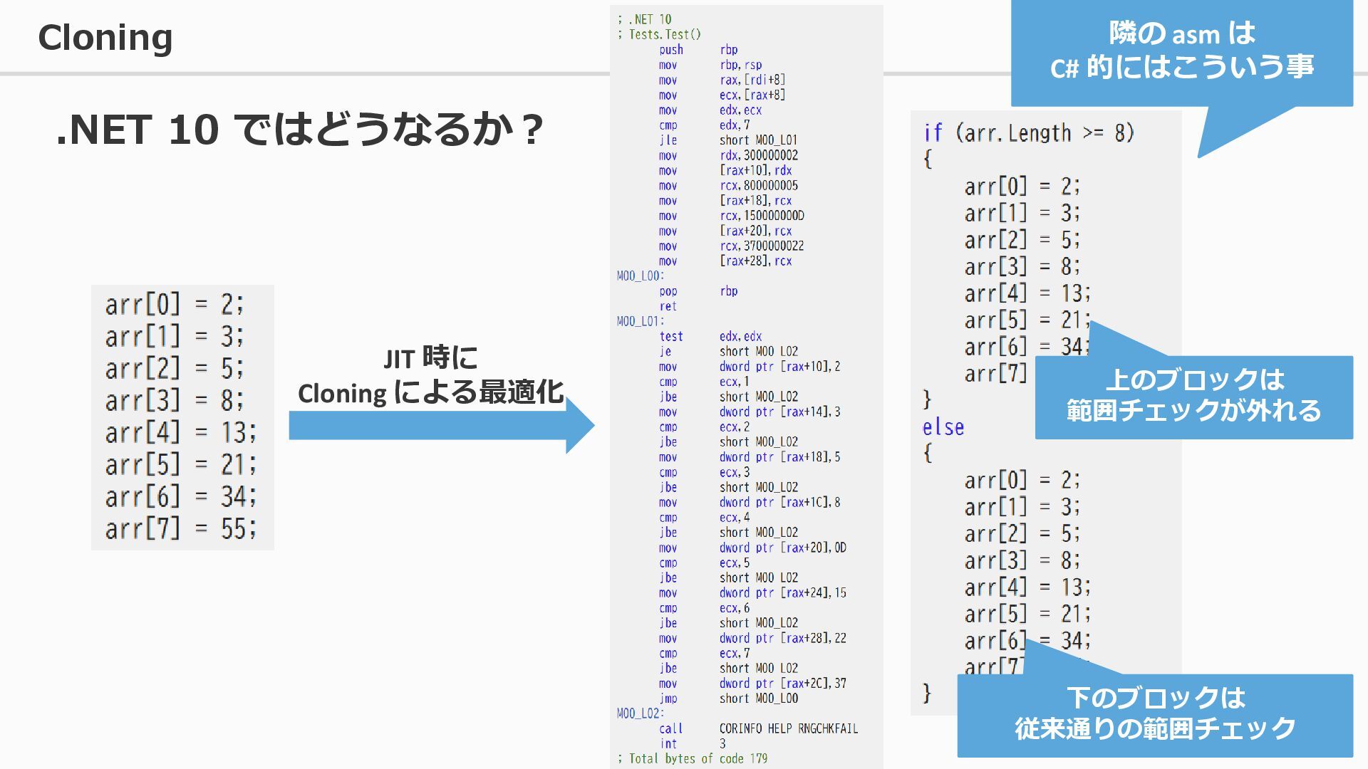 は span/arr と無関係なので 範囲チェックが必要 Span かつ .NET 9 の場合 毎回範囲チェック .NET 10 からは Span に対しても cloning が適用され 条件次第で範囲チェックが外れる Array の場合は Cloning で範囲チェックが 外れた asm が生成