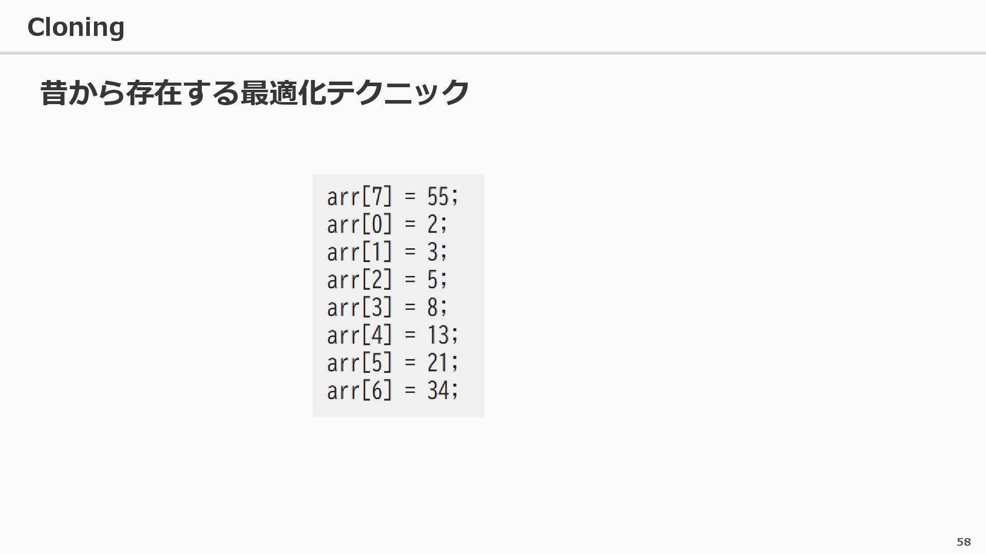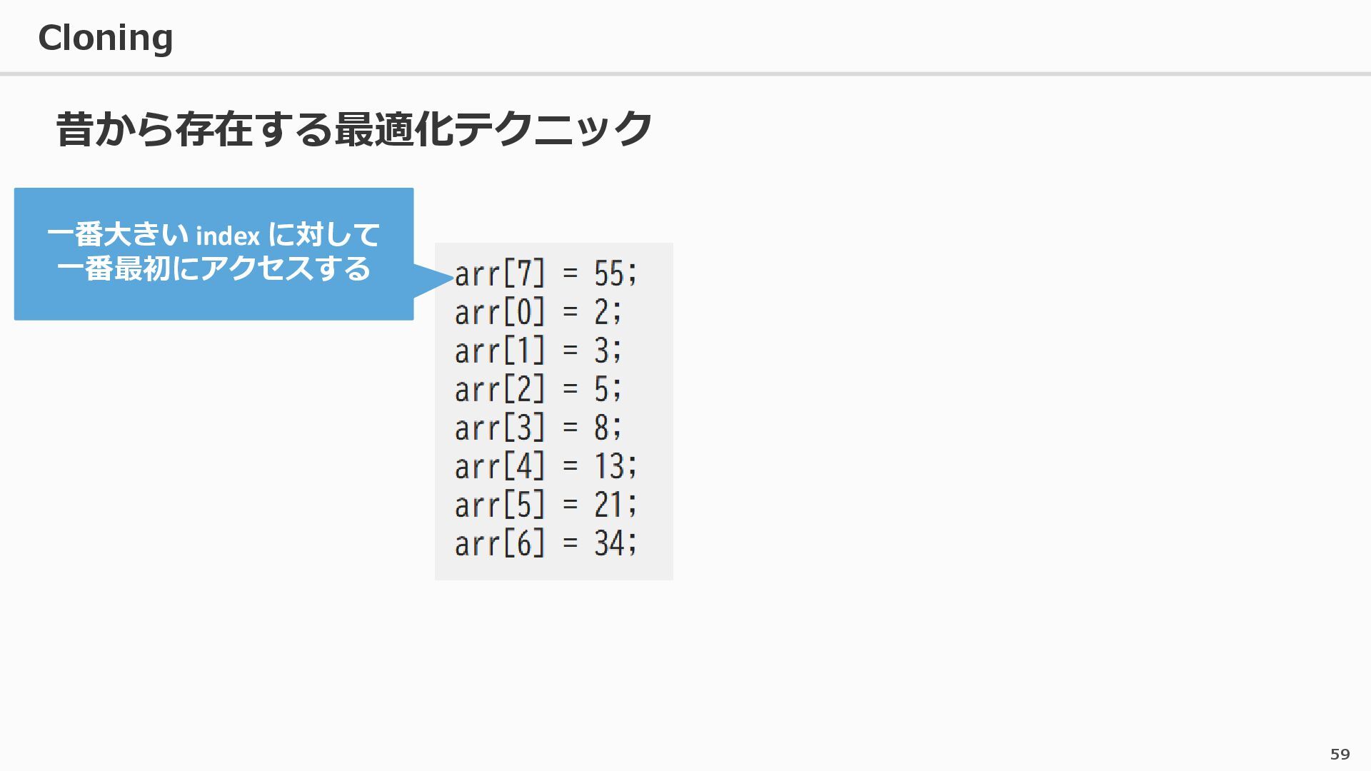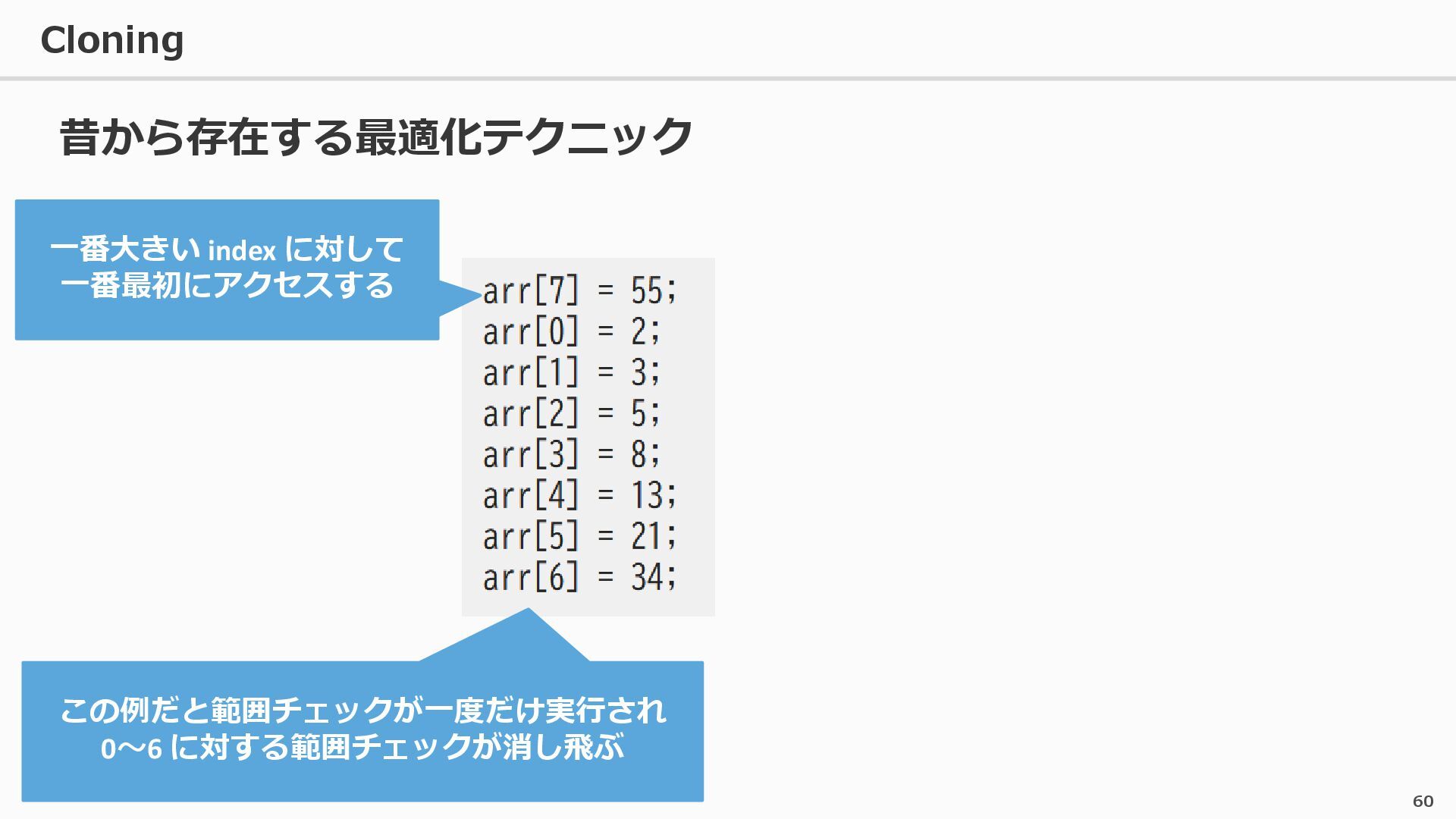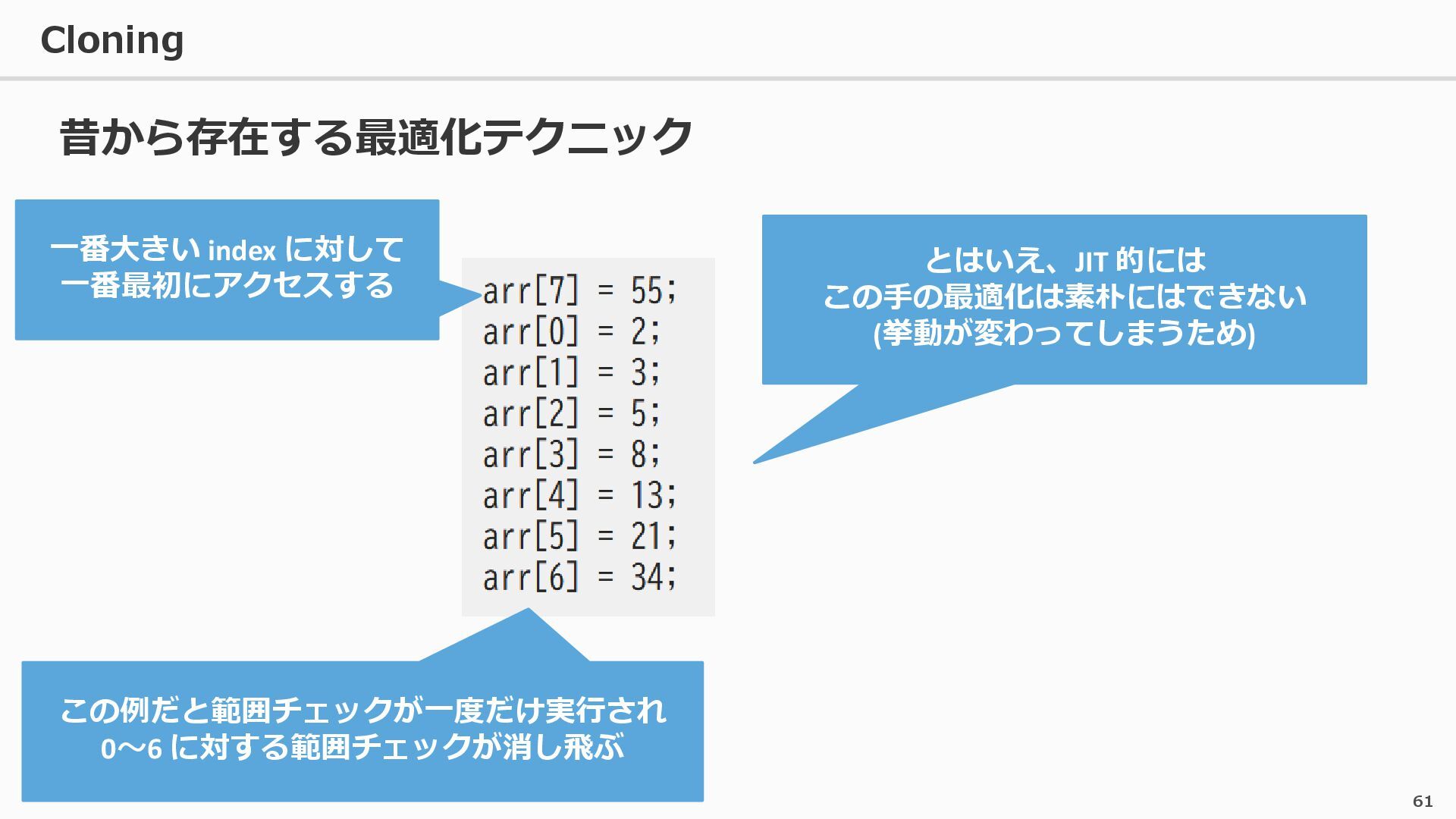 34. Cloning 61 昔から存在する最適化テクニック 一番大きい index に対して 一番最初にアクセスする とはいえ、JIT 的には この手の最適化は素朴にはできない