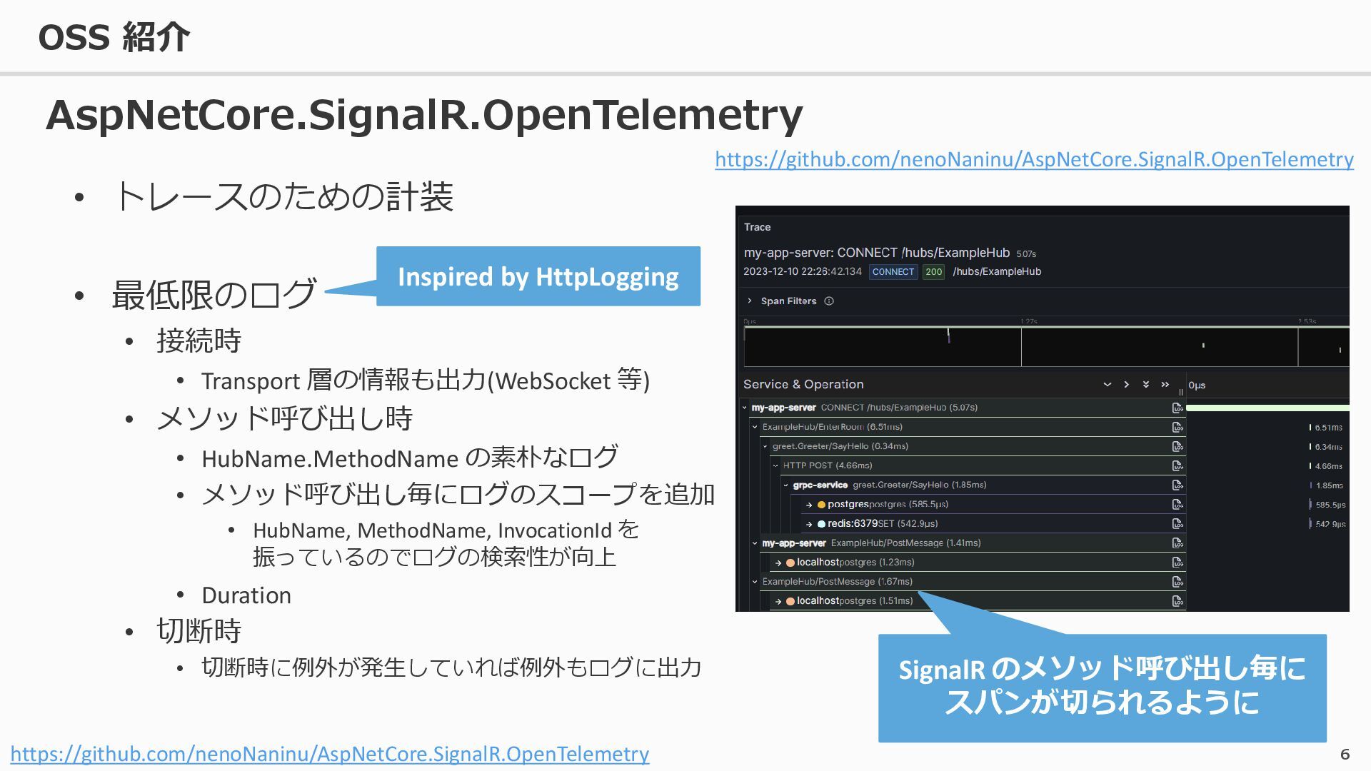 6. AspNetCore.SignalR.OpenTelemetry OSS 紹介 6 https://github.com/nenoNaninu/AspNetCore.SignalR.OpenTelemetry • トレースのための計装 • 最低限のログ •