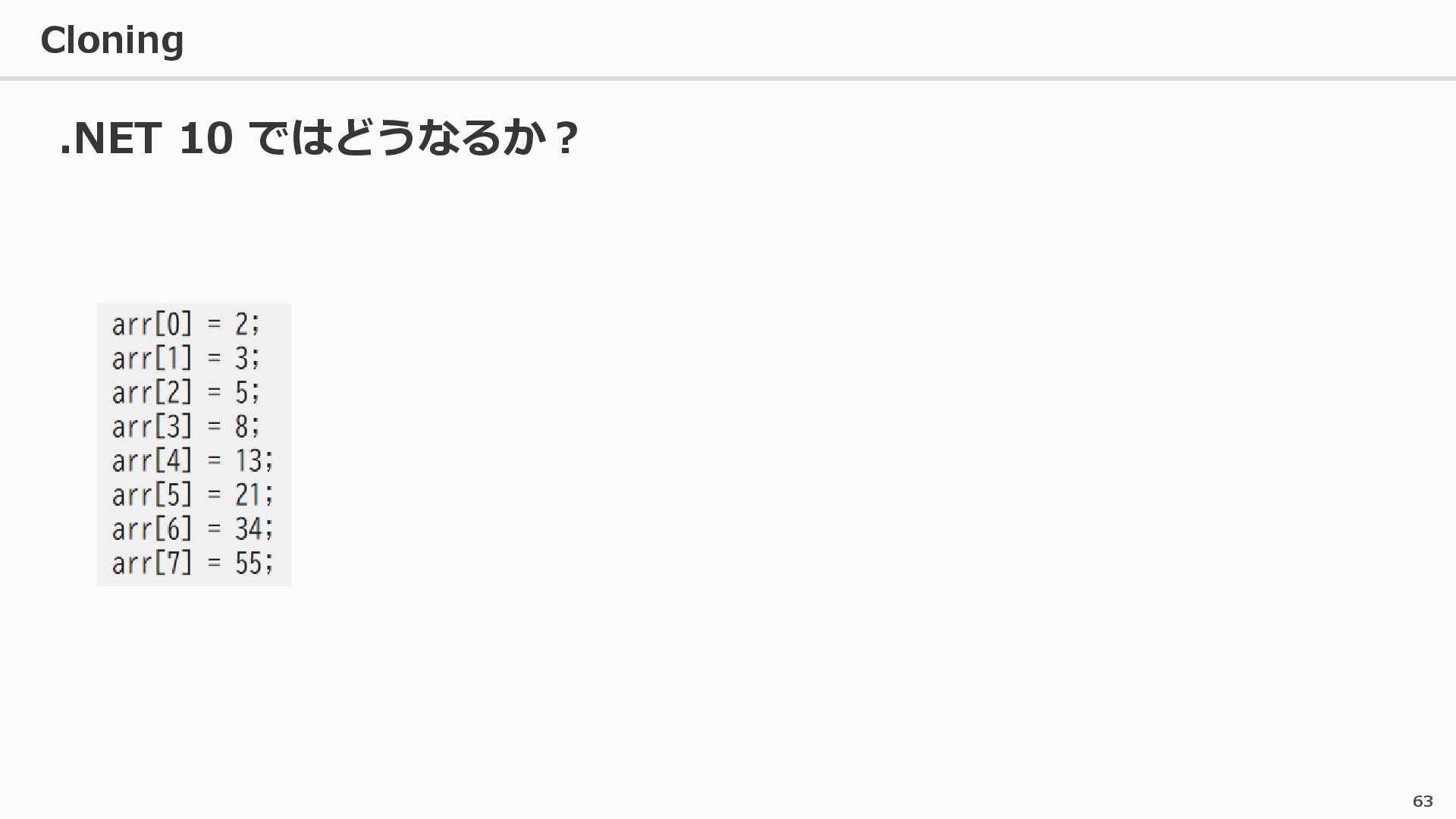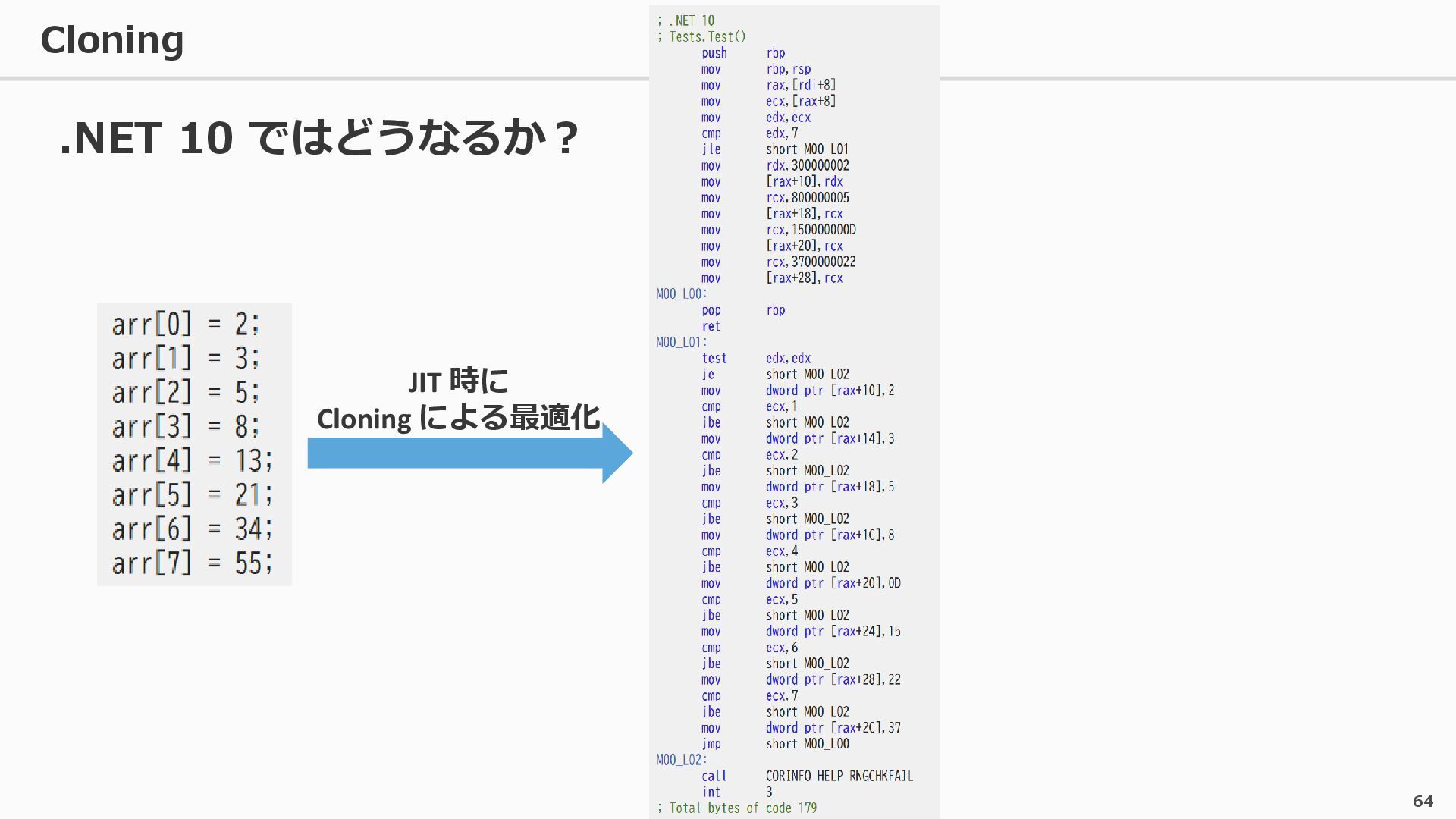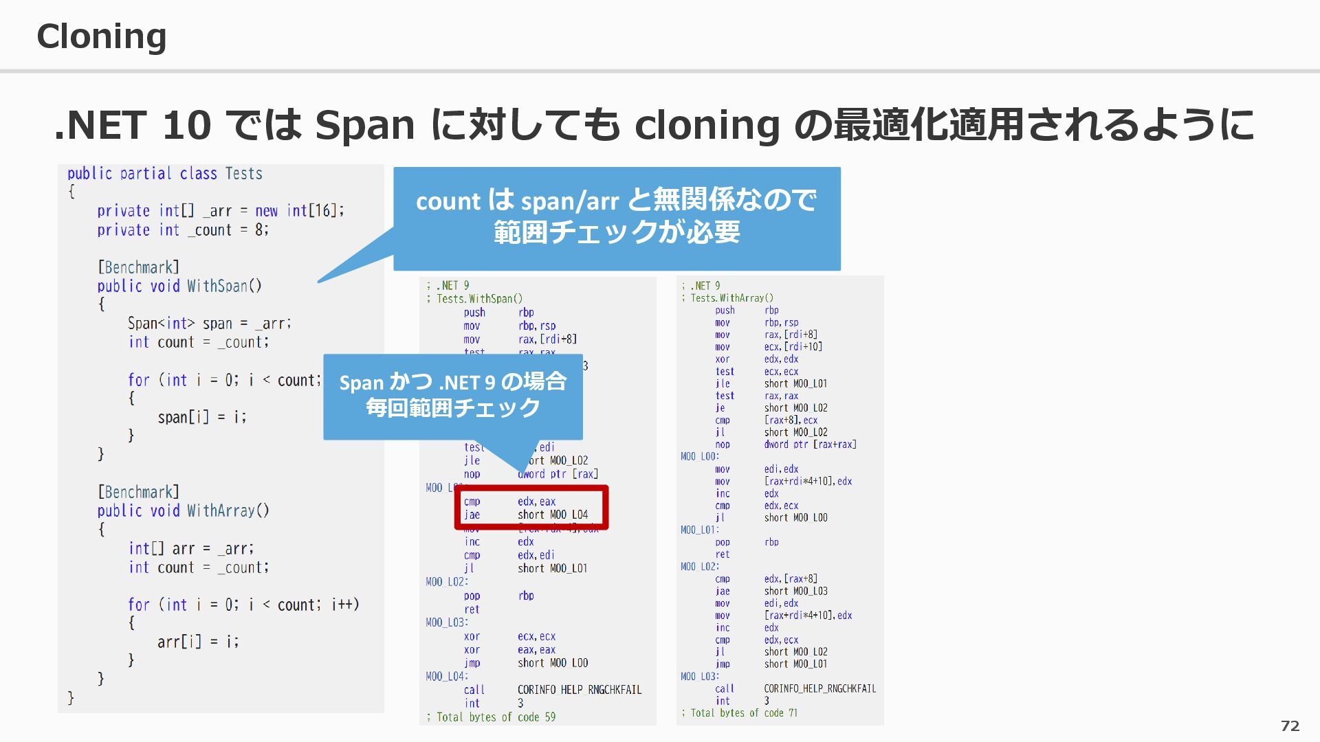 40. Cloning 72 .NET 10 では Span に対しても cloning の最適化適用されるように count