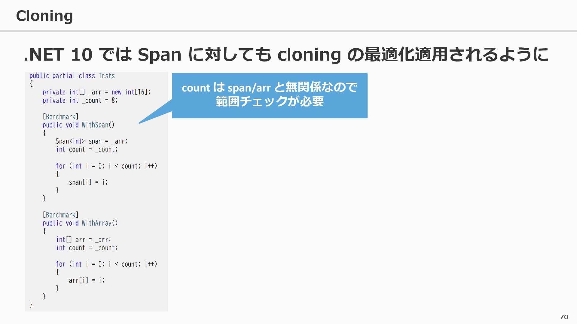 38. Cloning 70 .NET 10 では Span に対しても cloning の最適化適用されるように count