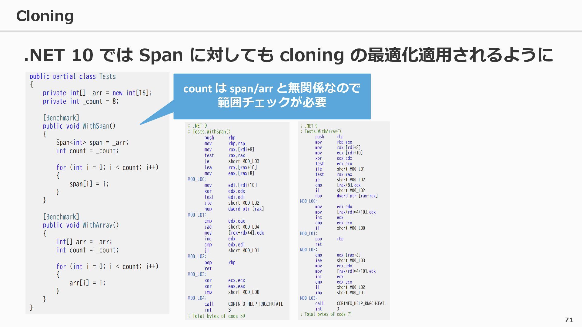 39. Cloning 71 .NET 10 では Span に対しても cloning の最適化適用されるように count