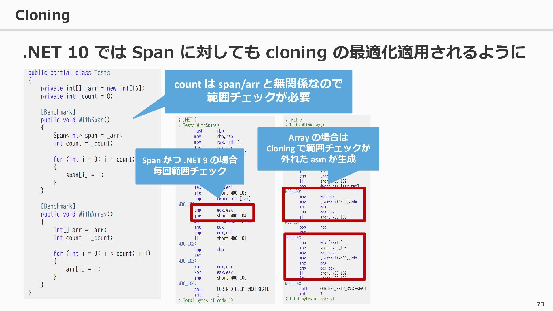 41. Cloning 73 .NET 10 では Span に対しても cloning の最適化適用されるように count