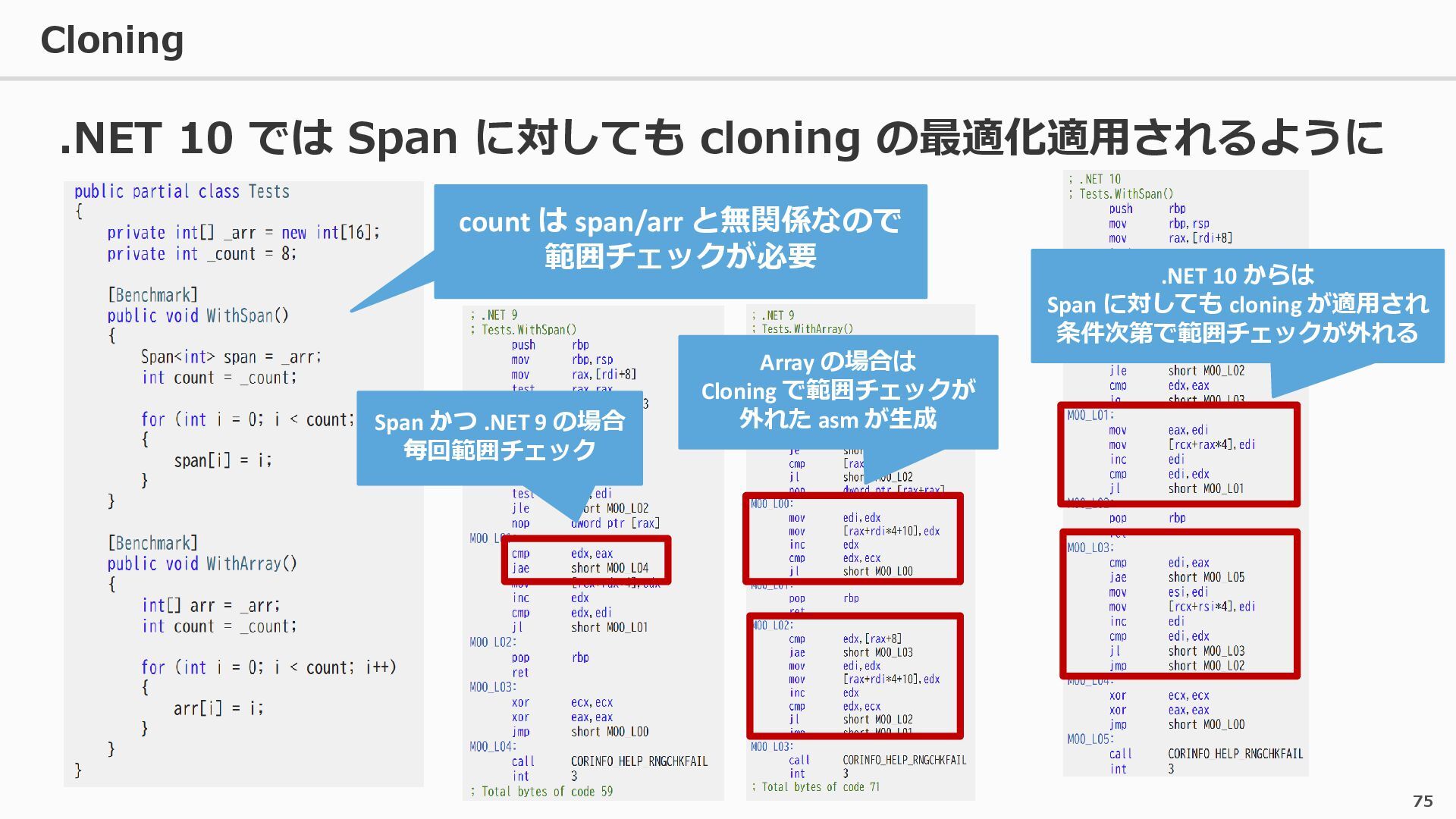 42. Cloning 74 .NET 10 では Span に対しても cloning の最適化適用されるように count
