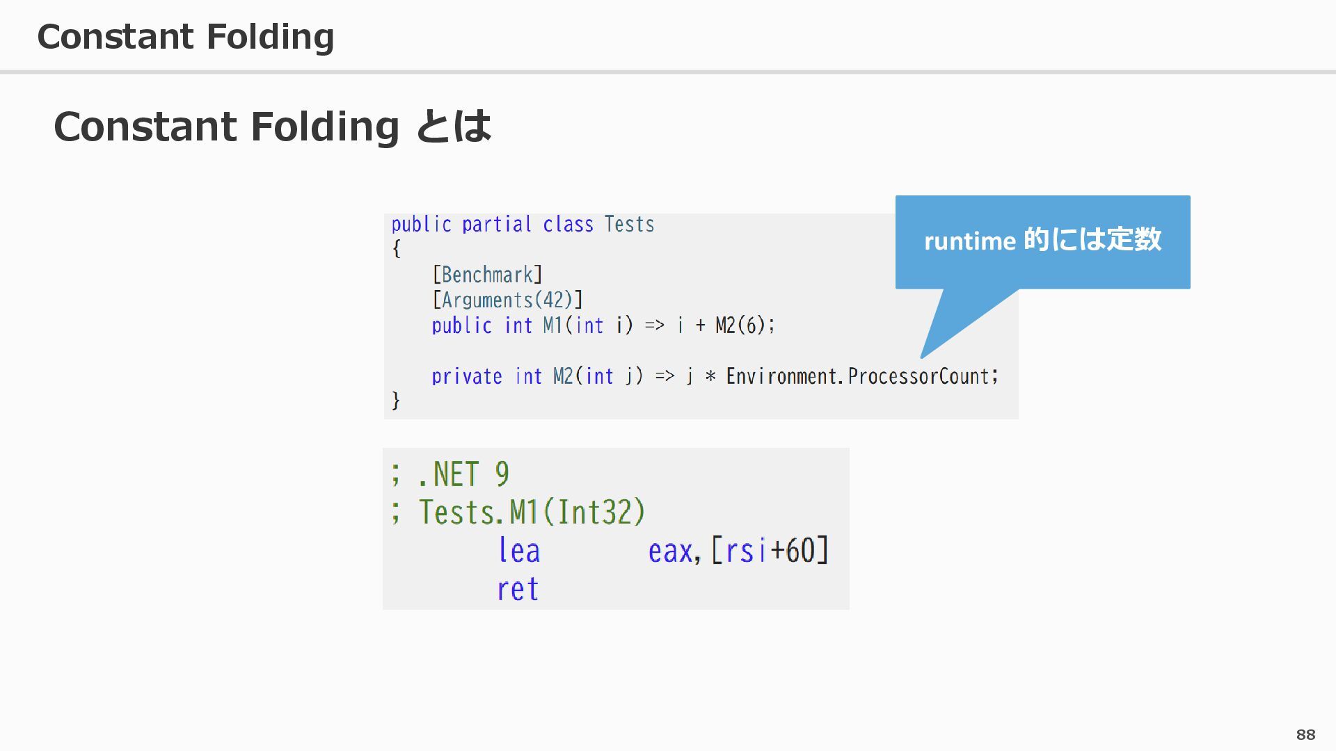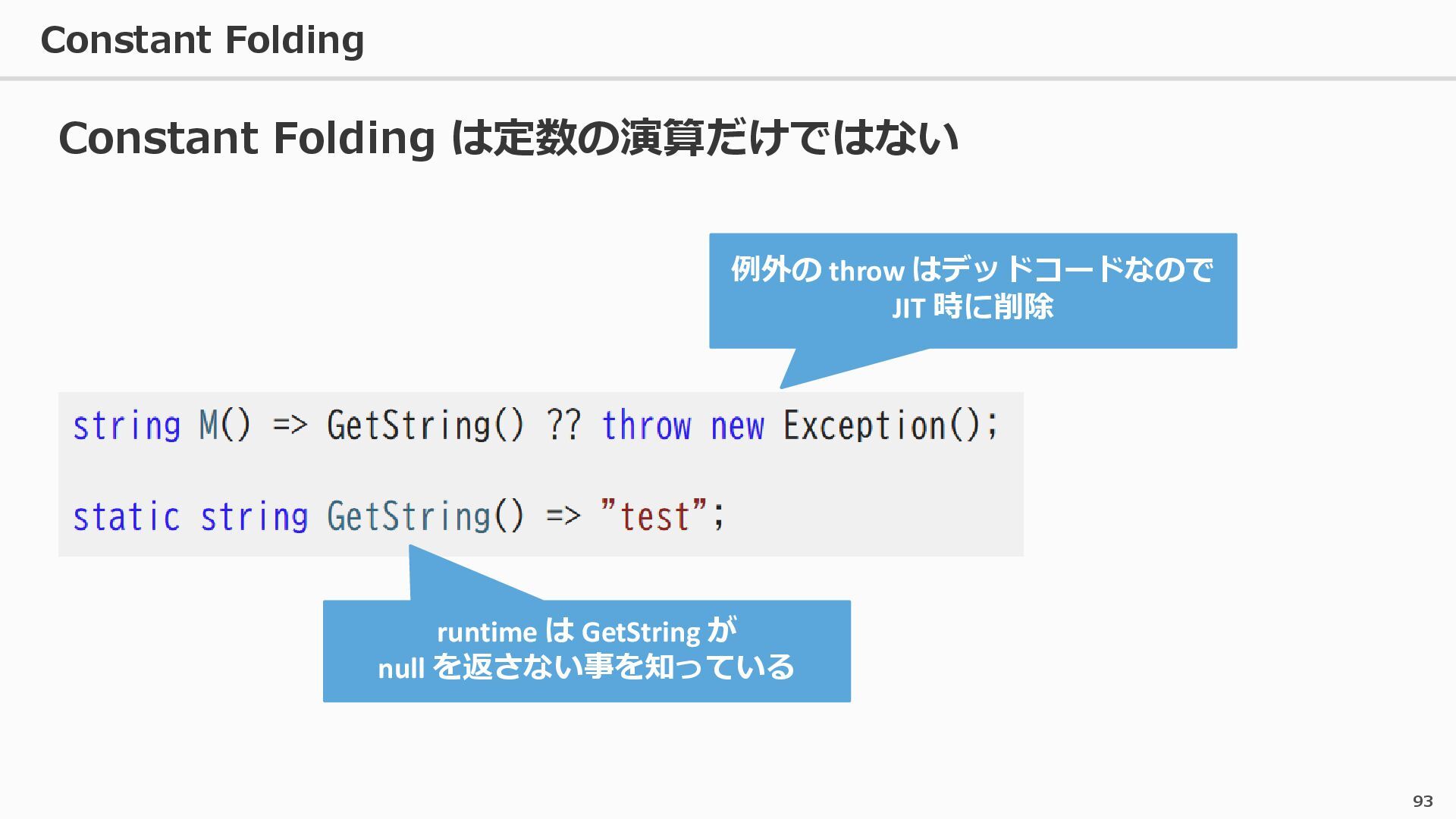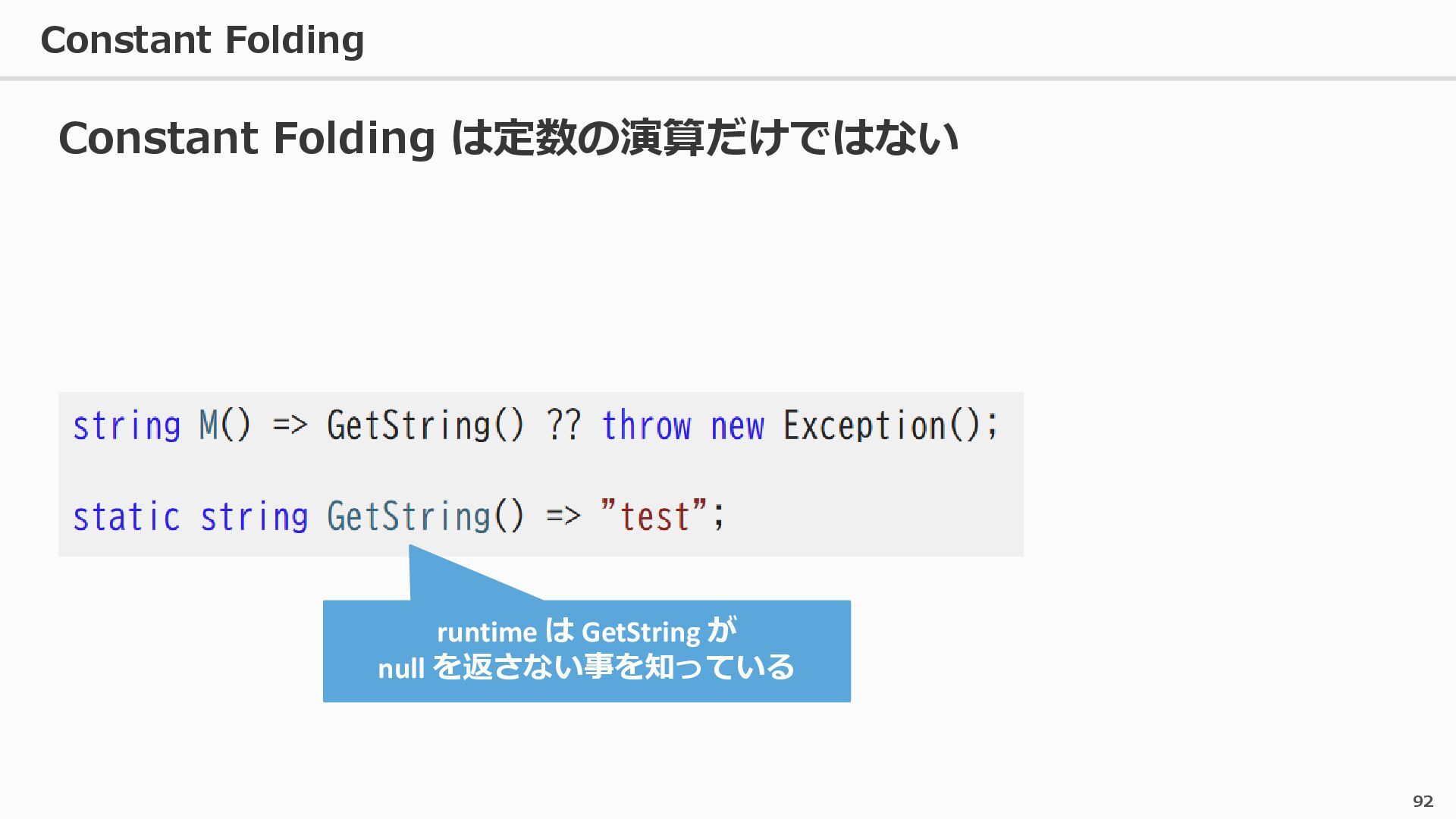 91. • JIT は特定のメソッドで最も頻繁に扱われる具象型を特定する • 特定した具象型に対して特化したコードを生成する • Devirtualization / Inlining /