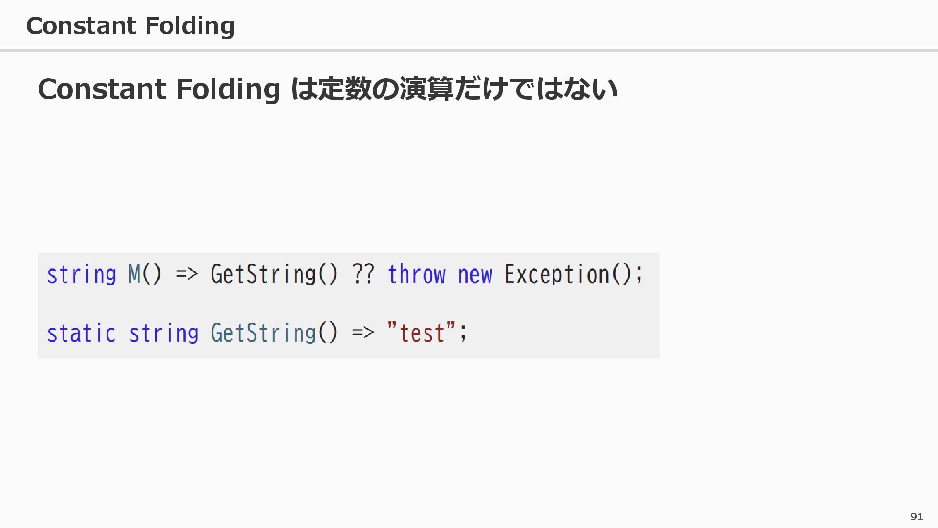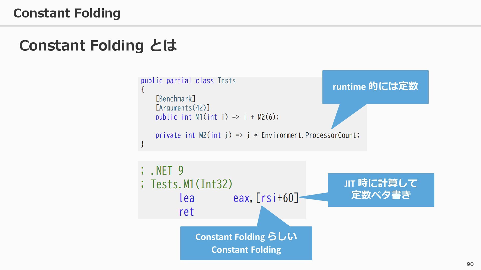 90. • JIT は特定のメソッドで最も頻繁に扱われる具象型を特定する • 特定した具象型に対して特化したコードを生成する • Devirtualization / Inlining /