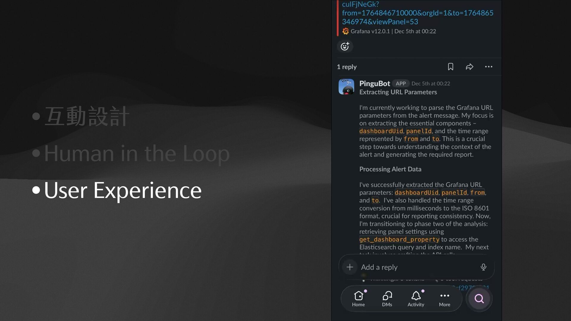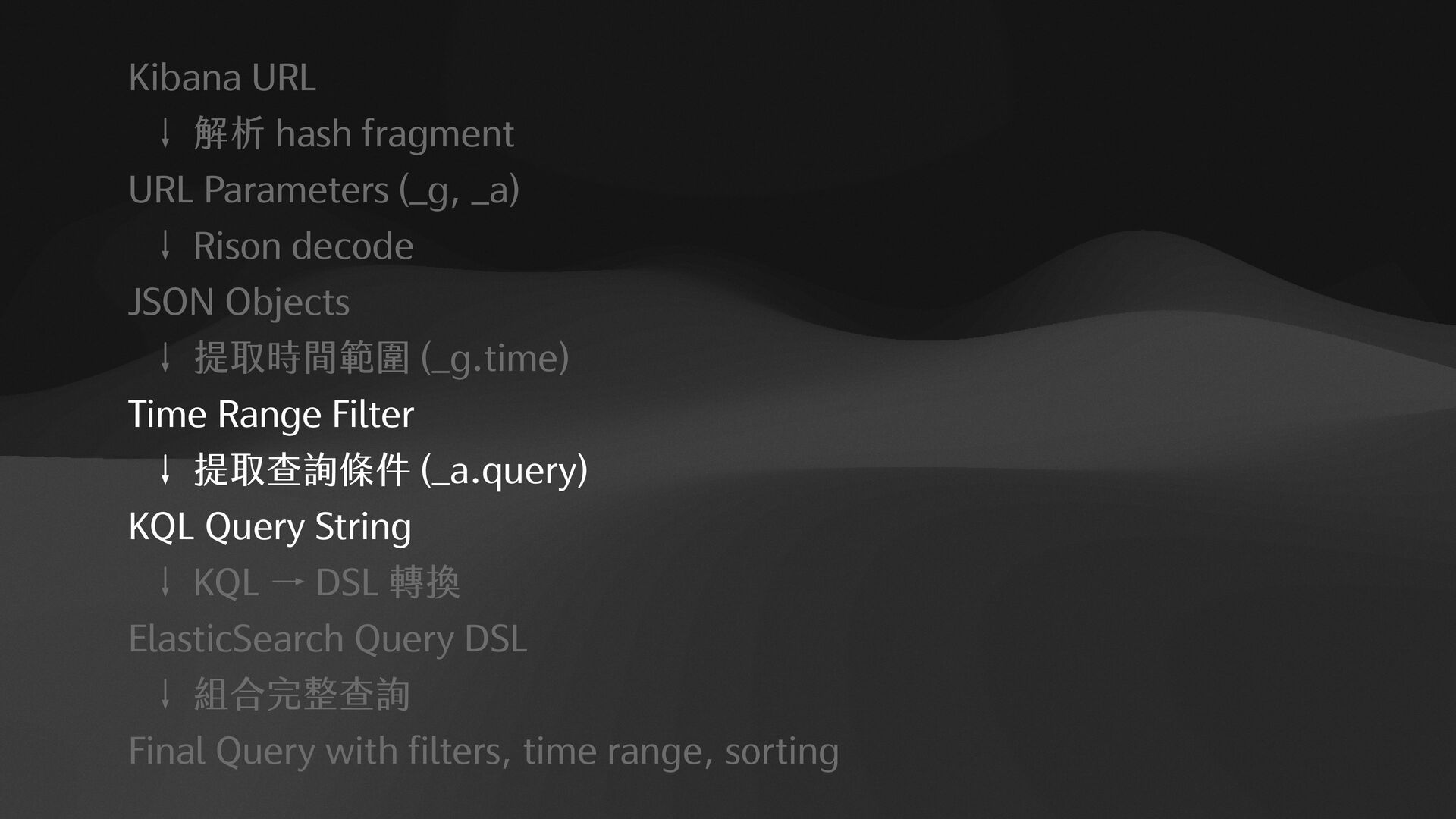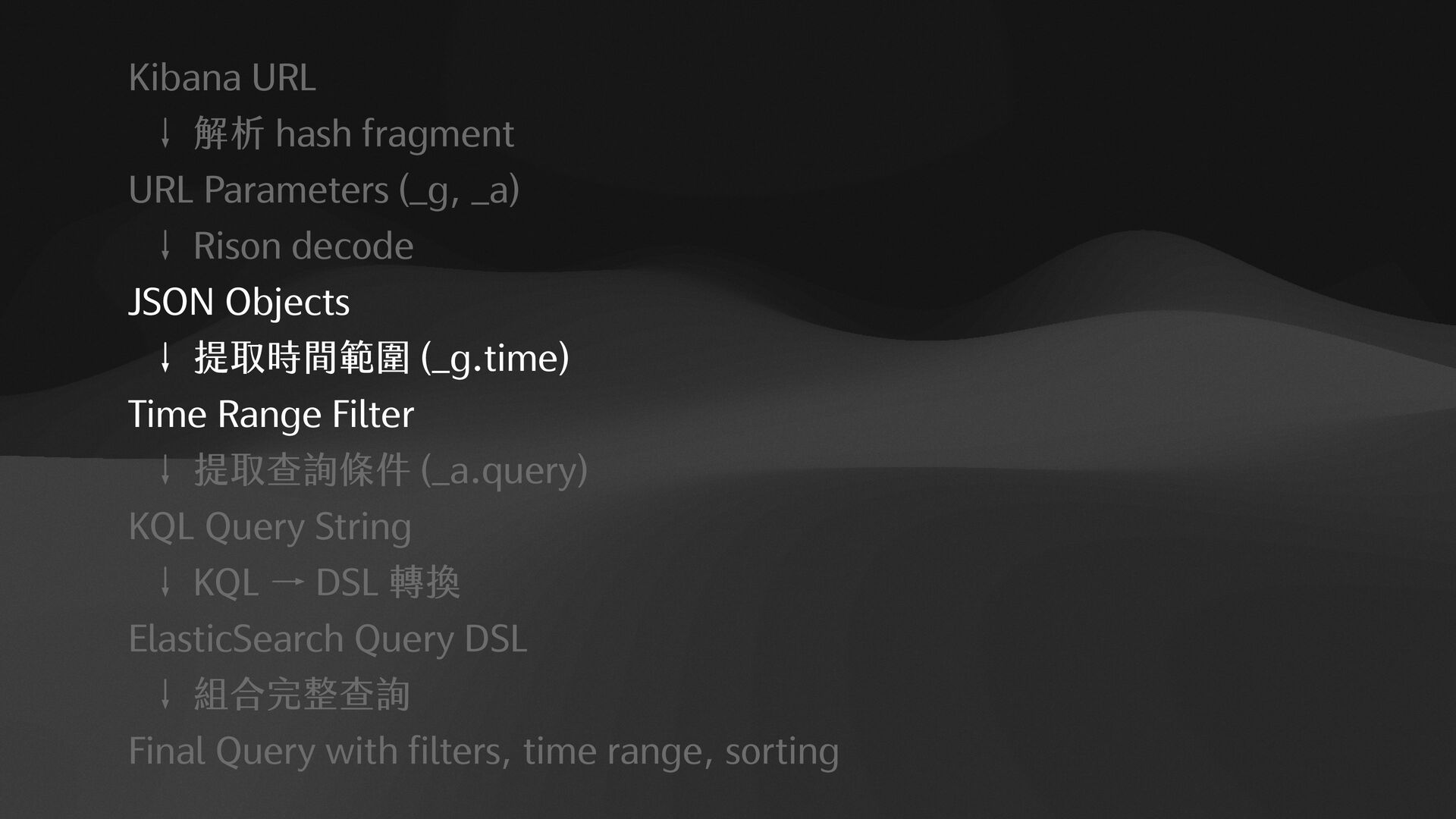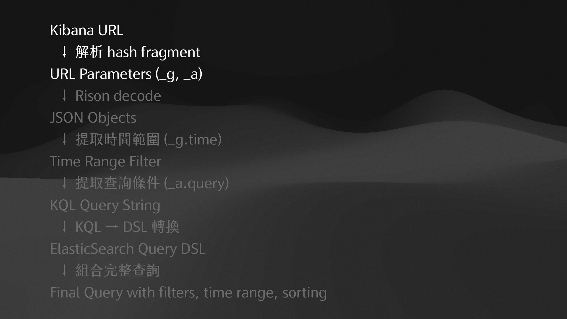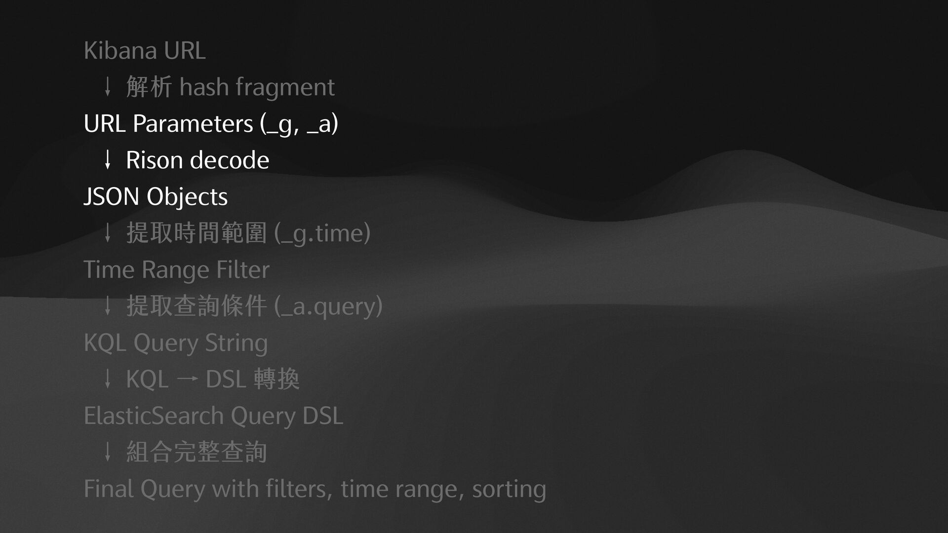 "filebeat-*", "type": "dataView" }, "filters": [], "interval": "auto", "query": { "language": "kuery", "query": "log.level:%20%22error%22%20" }, "sort": [ [ "@timestamp", "desc" ] ] } 1. RISON to JSON 2.KQL to ElasticSearch Query DSL {"bool":{"filter":[{"bool":{"should":[{"term":{ “log.level":{ "value":"error" } }}]}}]}}