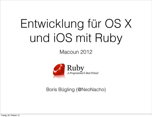 Ist Xcode schon wieder abgestürzt? Nervt das Neu-Kompilieren für jede kleine Änderung beim Testen? Oder will man einfach mal eine andere Programmiersprache für Mac/iOS Applikationen nutzen? Zur Abhilfe bietet dieser Vortrag eine leichte Einführung in die Entwicklung mit MacRuby und RubyMotion.
