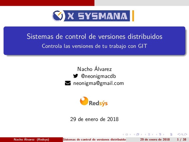 . . . . . . . . . . . . . . . . . . . . . . . . . . . . . . Sistemas de control de versiones distribuidos Controla las versiones de tu trabajo con GIT Nacho Álvarez @neonigmacdb [email protected] 29 de enero de 2018 Nacho Álvarez (Redsys) Sistemas de control de versiones distribuidos 29 de enero de 2018 1 / 38