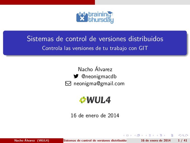 En esta charla repasamos los sistemas de control de versiones distribuidos existentes y los comparamos con los sistemas de control de versiones centralizados como SVN. Explicamos nuestra elección de Git sobre otros SCV distribuidos como Mercurial. Aprendemos cómo usar los comandos de git básicos, y damos una adelanto de comandos intermedios y avanzados. Describimos git submodules. Por último, comentamos algunas anécdotas y problemas existentes.