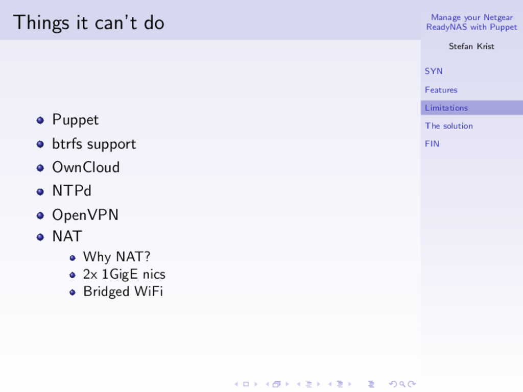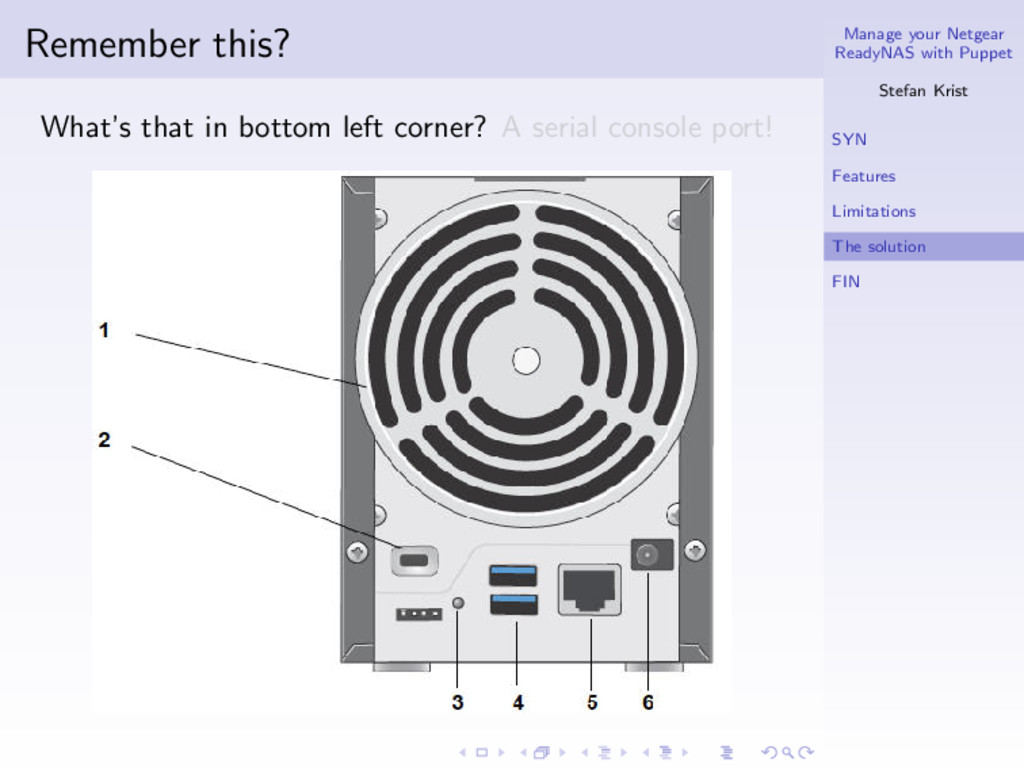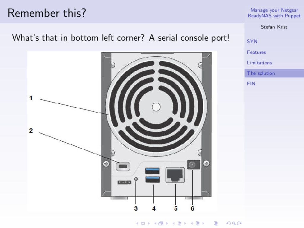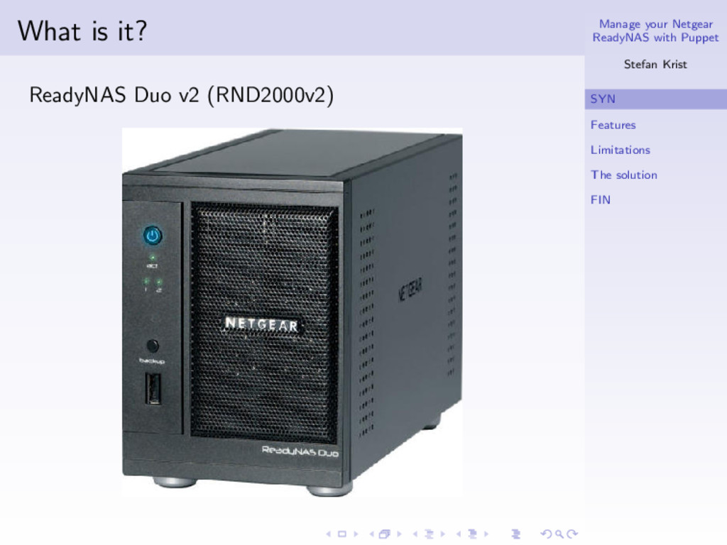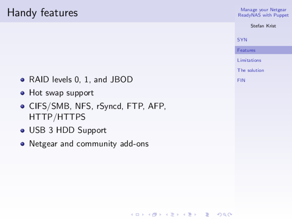 Limitations The solution FIN Handy features RAID levels 0, 1, and JBOD Hot swap support CIFS/SMB, NFS, rSyncd, FTP, AFP, HTTP/HTTPS USB 3 HDD Support Netgear and community add-ons