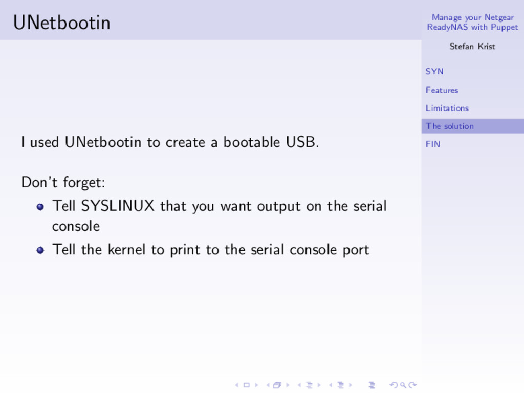 Limitations The solution FIN UNetbootin I used UNetbootin to create a bootable USB. Don’t forget: Tell SYSLINUX that you want output on the serial console Tell the kernel to print to the serial console port