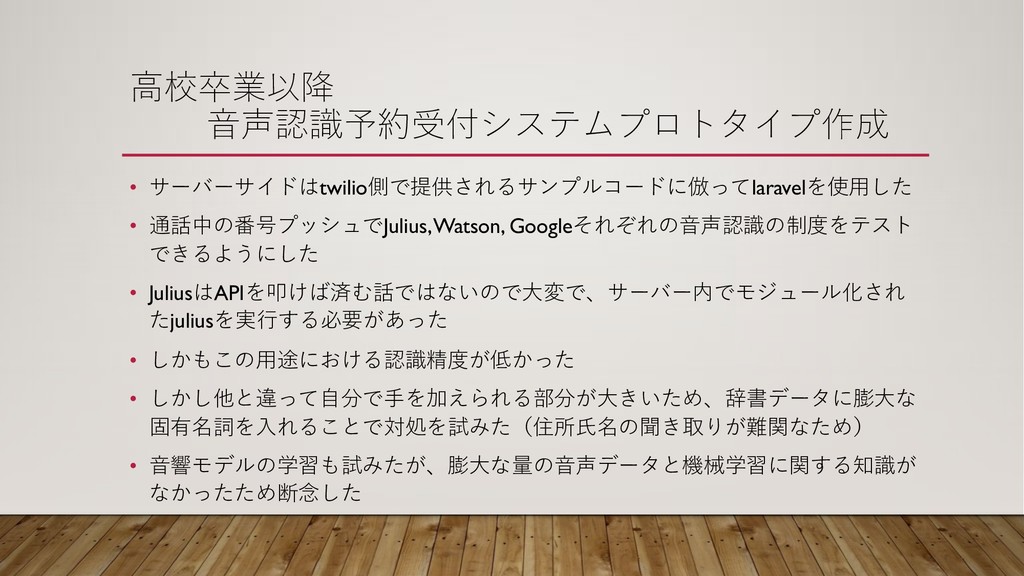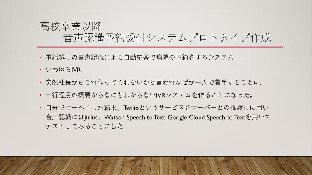 • IVR • C:6<3 1 (8;7 • (2=@.JIVR !"'3 • 4F& 0-Twilio%!$/? I ,9D5JuliusWatson Speech to Text, Google Cloud Speech to TextI "!#