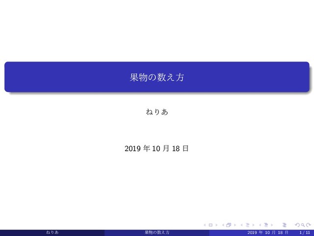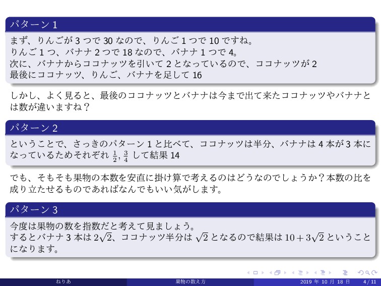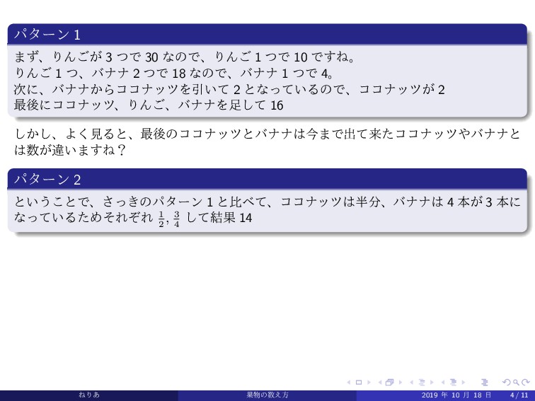 ύλʔϯ 2 ͷ߹ ՌͷຊΛֶʹམͱ͢ͷ͔ͳΓ͍͠ɻ ߟ͑ํͱͯ͠ɺͦΕͧΕͷՌʹ͕ଘࡏ͢Δͱߟ͑ͯɺͦͷΛຊͱ͢ΕΑ ͍ɻͭ·Γɺؔ f : F → R ͱͯ͠ɺՌ͕༩͑ΒΕͨͱ͖ͦͷՌͷݸɺຊΛ༩͑ Δؔͱ͢ΕΑ͍ɻ ྫ͑ b Λ 4 ຊͷόφφɺb′ Λ 3 ຊͷόφφͱ͢Δͱউखʹ 1 f(b) b = 1 f(b′) b′ ͱ͍͏͕ࣜ Γཱͭ͜ͱͱ͢ΕΑ͍ɻ ͢Δͱઌ΄Ͳͷࣜ a + a + a = 30 a + b + b = 18 b − c = 2 c′ + a + b′ =? ʹՃ͑ͯ 3b = 4b′, c = 2c′ ͱ͍͏ࣜߟ͑Δ͜ͱ͕Ͱ͖Δɻ݁Ռɺ? 14 ͱͳΔɻ ͶΓ͋ Ռͷ͑ํ 2019 10 ݄ 18 9 / 11