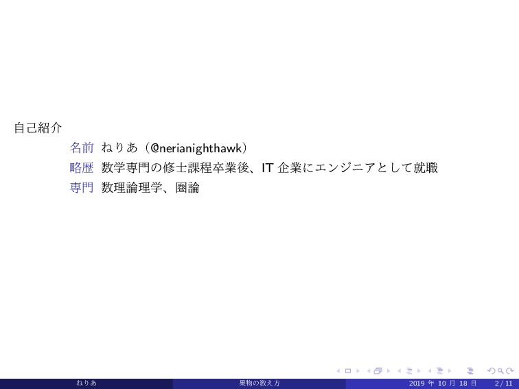 ࣗݾհ ໊લ ͶΓ͋ʢ@nerianighthawkʣ ུྺ ֶઐͷम࢜՝ఔଔۀޙɺIT اۀʹΤϯδχΞͱͯ͠ब৬ ઐ ཧཧֶɺݍ ͶΓ͋ Ռͷ͑ํ 2019 10 ݄ 18 2 / 11
