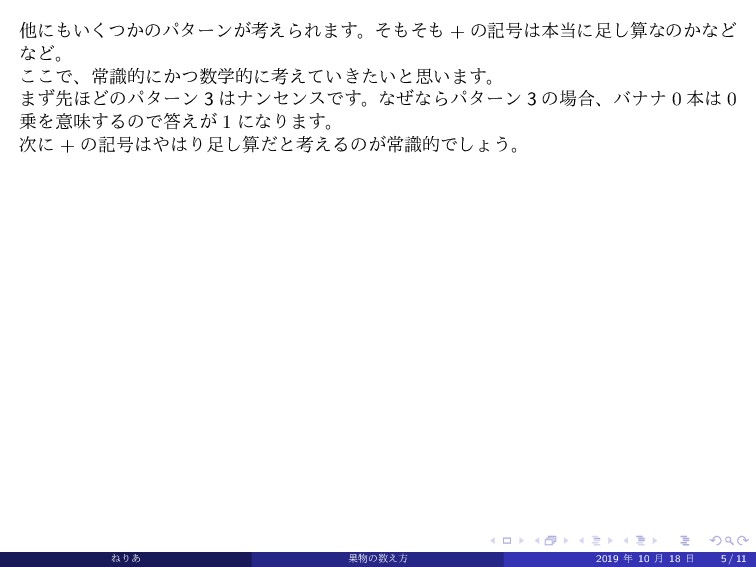 ଞʹ͍͔ͭ͘ͷύλʔϯ͕ߟ͑ΒΕ·͢ɻͦͦ + ͷه߸ຊʹ͠ࢉͳͷ͔ͳͲ ͳͲɻ ͜͜Ͱɺৗࣝతʹֶ͔ͭతʹߟ͍͖͍͑ͯͨͱࢥ͍·͢ɻ ·ͣઌ΄Ͳͷύλʔϯ 3 φϯηϯεͰ͢ɻͳͥͳΒύλʔϯ 3 ͷ߹ɺόφφ 0 ຊ 0 Λҙຯ͢ΔͷͰ͕͑ 1 ʹͳΓ·͢ɻ ࣍ʹ + ͷه߸Γ͠ࢉͩͱߟ͑Δͷ͕ৗࣝతͰ͠ΐ͏ɻ ͶΓ͋ Ռͷ͑ํ 2019 10 ݄ 18 5 / 11