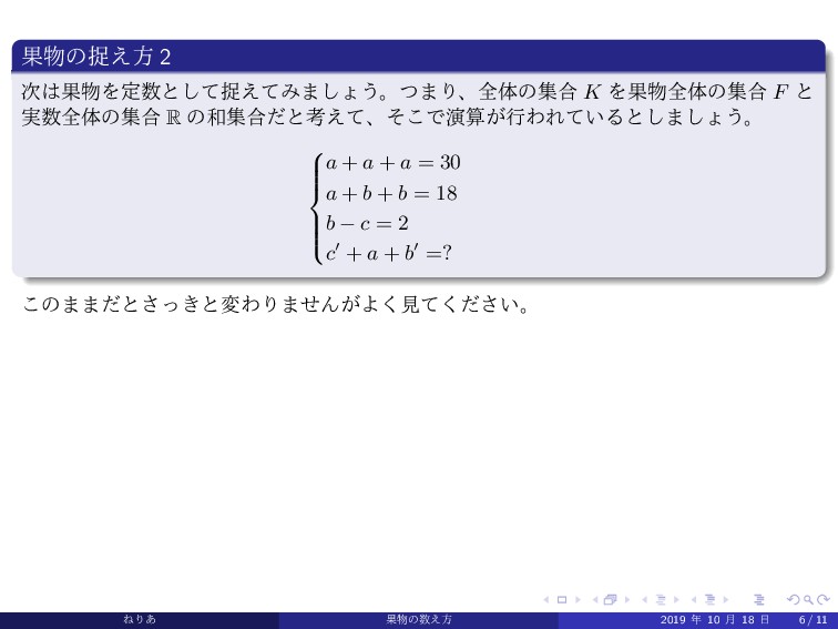 Ռͷଊ͑ํ 2 ࣍ՌΛఆͱͯ͠ଊ͑ͯΈ·͠ΐ͏ɻͭ·Γɺશମͷू߹ K ΛՌશମͷू߹ F ͱ ࣮શମͷू߹ R ͷू߹ͩͱߟ͑ͯɺͦ͜Ͱԋࢉ͕ߦΘΕ͍ͯΔͱ͠·͠ΐ͏ɻ a + a + a = 30 a + b + b = 18 b − c = 2 c′ + a + b′ =? ͜ͷ··ͩͱ͖ͬ͞ͱมΘΓ·ͤΜ͕Α͘ݟ͍ͯͩ͘͞ɻ ͶΓ͋ Ռͷ͑ํ 2019 10 ݄ 18 6 / 11