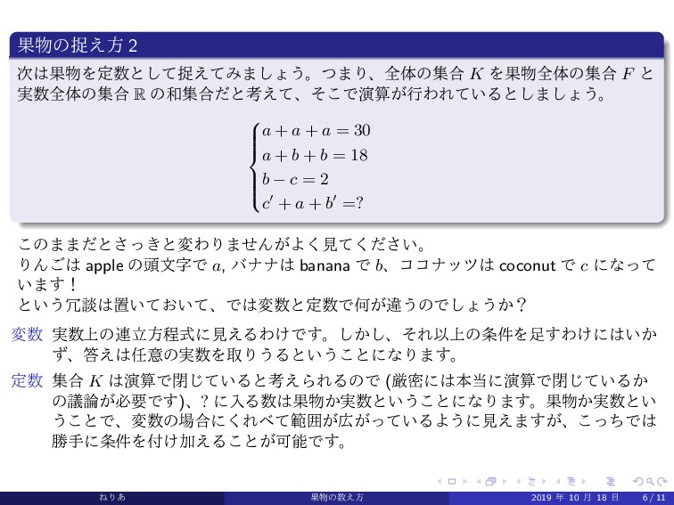 Ռͷଊ͑ํ 2 ࣍ՌΛఆͱͯ͠ଊ͑ͯΈ·͠ΐ͏ɻͭ·Γɺશମͷू߹ K ΛՌશମͷू߹ F ͱ ࣮શମͷू߹ R ͷू߹ͩͱߟ͑ͯɺͦ͜Ͱԋࢉ͕ߦΘΕ͍ͯΔͱ͠·͠ΐ͏ɻ a + a + a = 30 a + b + b = 18 b − c = 2 c′ + a + b′ =? ͜ͷ··ͩͱ͖ͬ͞ͱมΘΓ·ͤΜ͕Α͘ݟ͍ͯͩ͘͞ɻ ΓΜ͝ apple ͷ಄จࣈͰ a, όφφ banana Ͱ bɺίίφοπ coconut Ͱ c ʹͳͬͯ ͍·͢ʂ ͱ͍͏ஊஔ͍͓͍ͯͯɺͰมͱఆͰԿ͕ҧ͏ͷͰ͠ΐ͏͔ʁ ม ্࣮ͷ࿈ཱํఔࣜʹݟ͑ΔΘ͚Ͱ͢ɻ͔͠͠ɺͦΕҎ্ͷ݅Λ͢Θ͚ʹ͍͔ ͣɺ͑ҙͷ࣮ΛऔΓ͏Δͱ͍͏͜ͱʹͳΓ·͢ɻ ఆ ू߹ K ԋࢉͰด͍ͯ͡Δͱߟ͑ΒΕΔͷͰ (ݫີʹຊʹԋࢉͰด͍ͯ͡Δ͔ ͷ͕ٞඞཁͰ͢)ɺ? ʹೖΔՌ͔࣮ͱ͍͏͜ͱʹͳΓ·͢ɻՌ͔࣮ͱ͍ ͏͜ͱͰɺมͷ߹ʹ͘Εͯൣғ͕͕͍ͬͯΔΑ͏ʹݟ͑·͕͢ɺͬͪ͜Ͱ উखʹ݅Λ͚Ճ͑Δ͜ͱ͕ՄೳͰ͢ɻ ͶΓ͋ Ռͷ͑ํ 2019 10 ݄ 18 6 / 11
