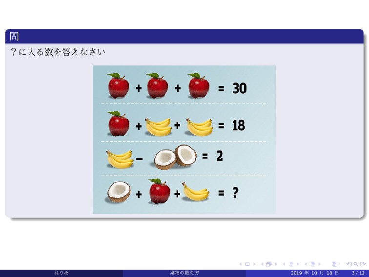 Ռͷଊ͑ํ 2 ࣍ՌΛఆͱͯ͠ଊ͑ͯΈ·͠ΐ͏ɻͭ·Γɺશମͷू߹ K ΛՌશମͷू߹ F ͱ ࣮શମͷू߹ R ͷू߹ͩͱߟ͑ͯɺͦ͜Ͱԋࢉ͕ߦΘΕ͍ͯΔͱ͠·͠ΐ͏ɻ a + a + a = 30 a + b + b = 18 b − c = 2 c′ + a + b′ =? ͜ͷ··ͩͱ͖ͬ͞ͱมΘΓ·ͤΜ͕Α͘ݟ͍ͯͩ͘͞ɻ ΓΜ͝ apple ͷ಄จࣈͰ a, όφφ banana Ͱ bɺίίφοπ coconut Ͱ c ʹͳͬͯ ͍·͢ʂ ͶΓ͋ Ռͷ͑ํ 2019 10 ݄ 18 6 / 11