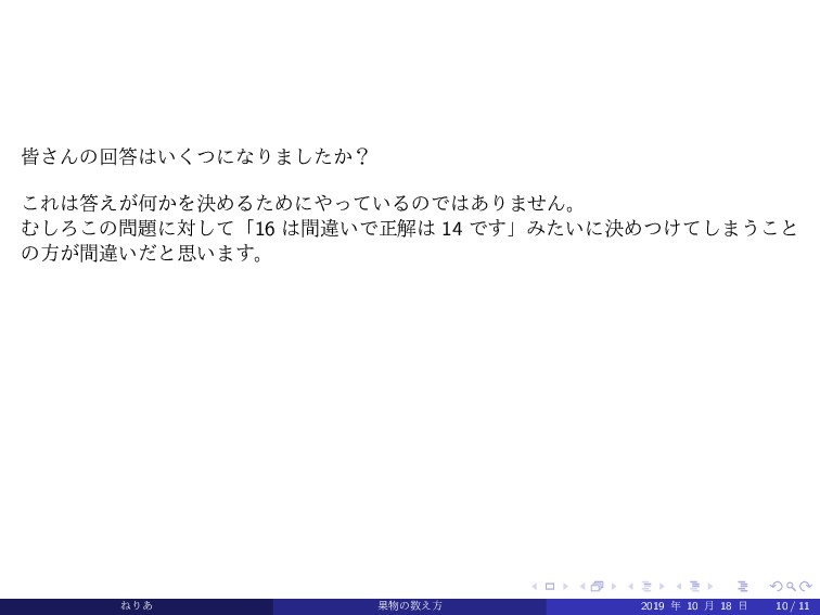 օ͞Μͷճ͍ͭ͘ʹͳΓ·͔ͨ͠ʁ ͜Ε͕͑Կ͔ΛܾΊΔͨΊʹ͍ͬͯΔͷͰ͋Γ·ͤΜɻ Ή͠Ζ͜ͷʹରͯ͠ʮ16 ؒҧ͍Ͱਖ਼ղ 14 Ͱ͢ʯΈ͍ͨʹܾΊ͚ͭͯ͠·͏͜ͱ ͷํ͕ؒҧ͍ͩͱࢥ͍·͢ɻ ͔͠͠ɺ͕͑ 16 ͩͱࢥ͏͔Βʹͦ͏ࢥ͏ཧ༝͕͋ΔͣͰ͢ɻֶΛษڧ͍ͯ͠Ε ɺͦͷཧ༝Λଞͷਓʹ͏·͘આ໌Ͱ͖Δͱࢥ͍·͢ɻ ͶΓ͋ Ռͷ͑ํ 2019 10 ݄ 18 10 / 11