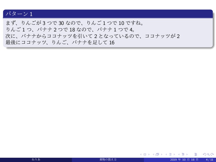 ύλʔϯ 1 ·ͣɺΓΜ͕͝ 3 ͭͰ 30 ͳͷͰɺΓΜ͝ 1 ͭͰ 10 Ͱ͢Ͷɻ ΓΜ͝ 1 ͭɺόφφ 2 ͭͰ 18 ͳͷͰɺόφφ 1 ͭͰ 4ɻ ࣍ʹɺόφφ͔ΒίίφοπΛҾ͍ͯ 2 ͱͳ͍ͬͯΔͷͰɺίίφοπ͕ 2 ࠷ޙʹίίφοπɺΓΜ͝ɺόφφΛͯ͠ 16 ͶΓ͋ Ռͷ͑ํ 2019 10 ݄ 18 4 / 11