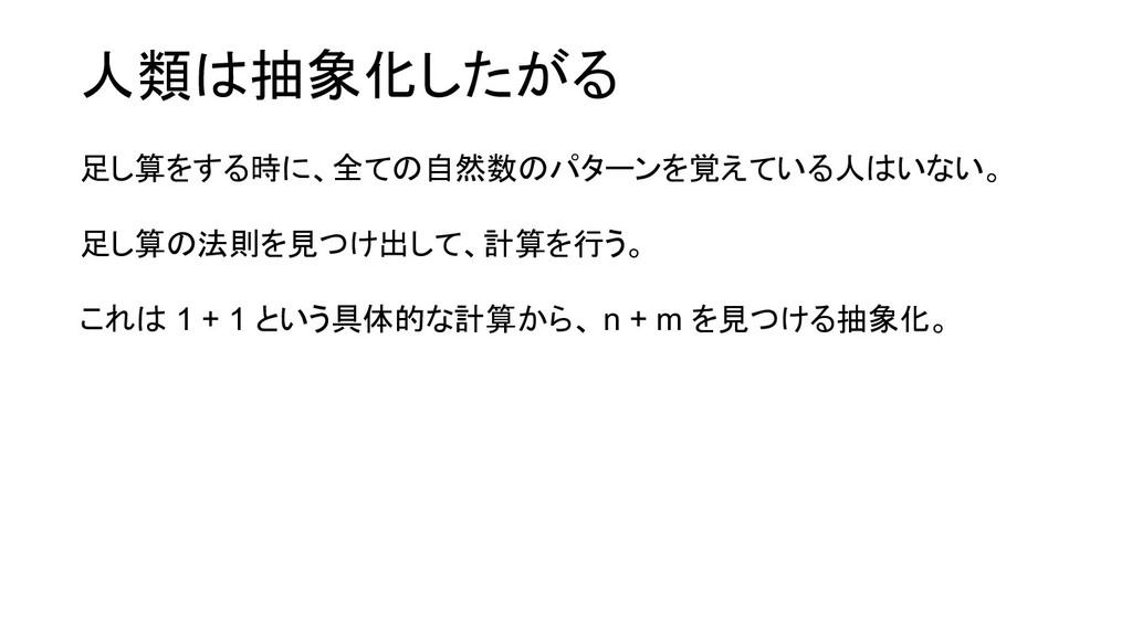 人類は抽象化したがる 足し算をする時に、全ての自然数のパターンを覚えている人はいない。 足し算の法則を見つけ出して、計算を行う。 これは 1 + 1 という具体的な計算から、 n +