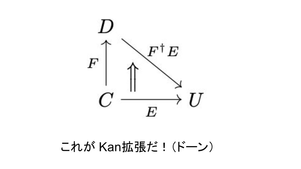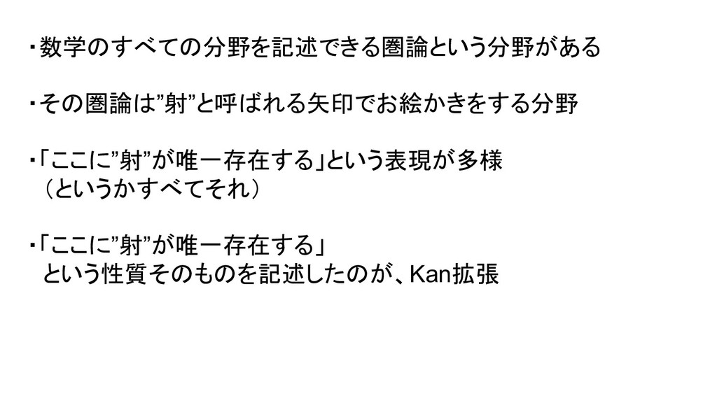 ・数学のすべての分野を記述できる圏論という分野がある ・その圏論は”射”と呼ばれる矢印でお絵かきをする分野 ・「ここに”射”が唯一存在する」という表現が多様 (というかすべてそれ) ・「ここに”射”が唯一存在する」 という性質そのものを記述したのが、Kan拡張
