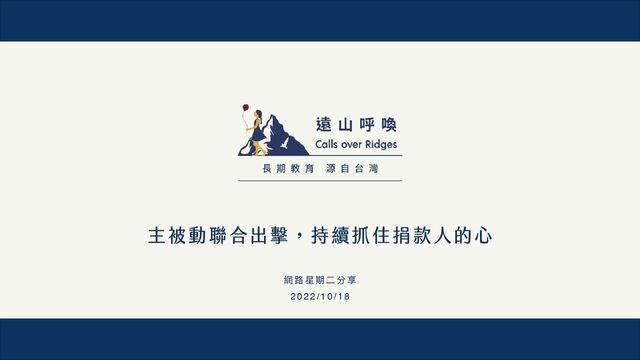 募集新的捐款者加入並不容易,所以要如何持續抓住現有捐款人的心很重要!在這次的分享中,我們邀請到遠山呼喚的品牌行銷總監 Danny 來跟大家聊聊:透過捐款人經營可以達到哪些目的?又應該如何了解捐款者,讓經營策略更精確?以及透過主動及被動兩大面向的持續溝通,畫出捐款人的旅程地圖,逐步踏實地建立起捐款人對於品牌的擁護度。