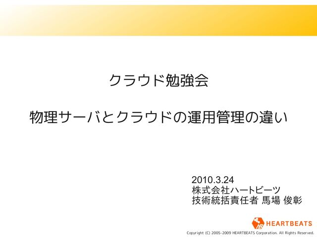 Copyright (C) 2005-2009 HEARTBEATS Corporation. All Rights Reserved. クラウド勉強会 物理サーバとクラウドの運用管理の違い