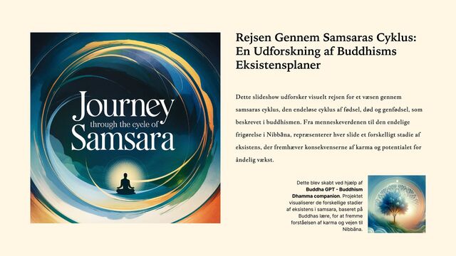 Dette slideshow udforsker visuelt rejsen for et væsen gennem samsaras cyklus, den endeløse cyklus af fødsel, død og genfødsel, som beskrevet i buddhismen. Fra menneskeverdenen til den endelige frigørelse i Nibbāna, repræsenterer hver slide et forskelligt stadie af eksistens, der fremhæver konsekvenserne af karma og potentialet for åndelig vækst.