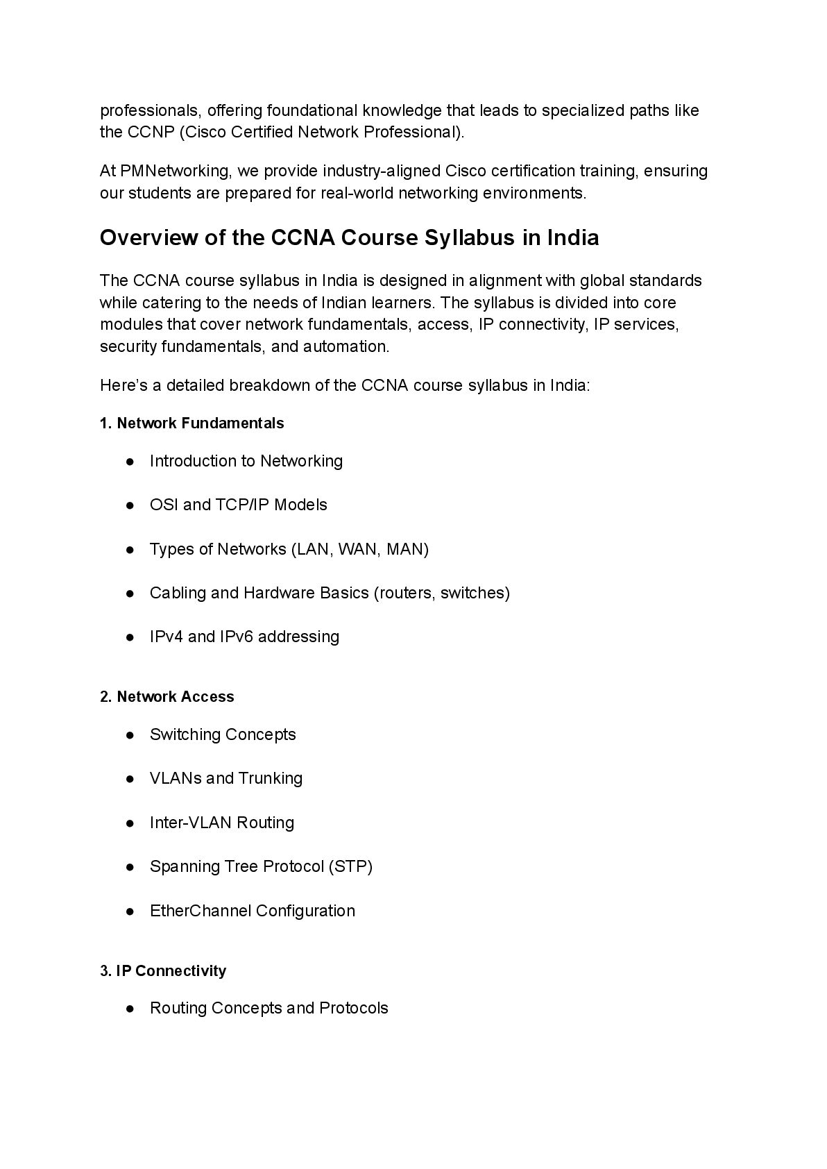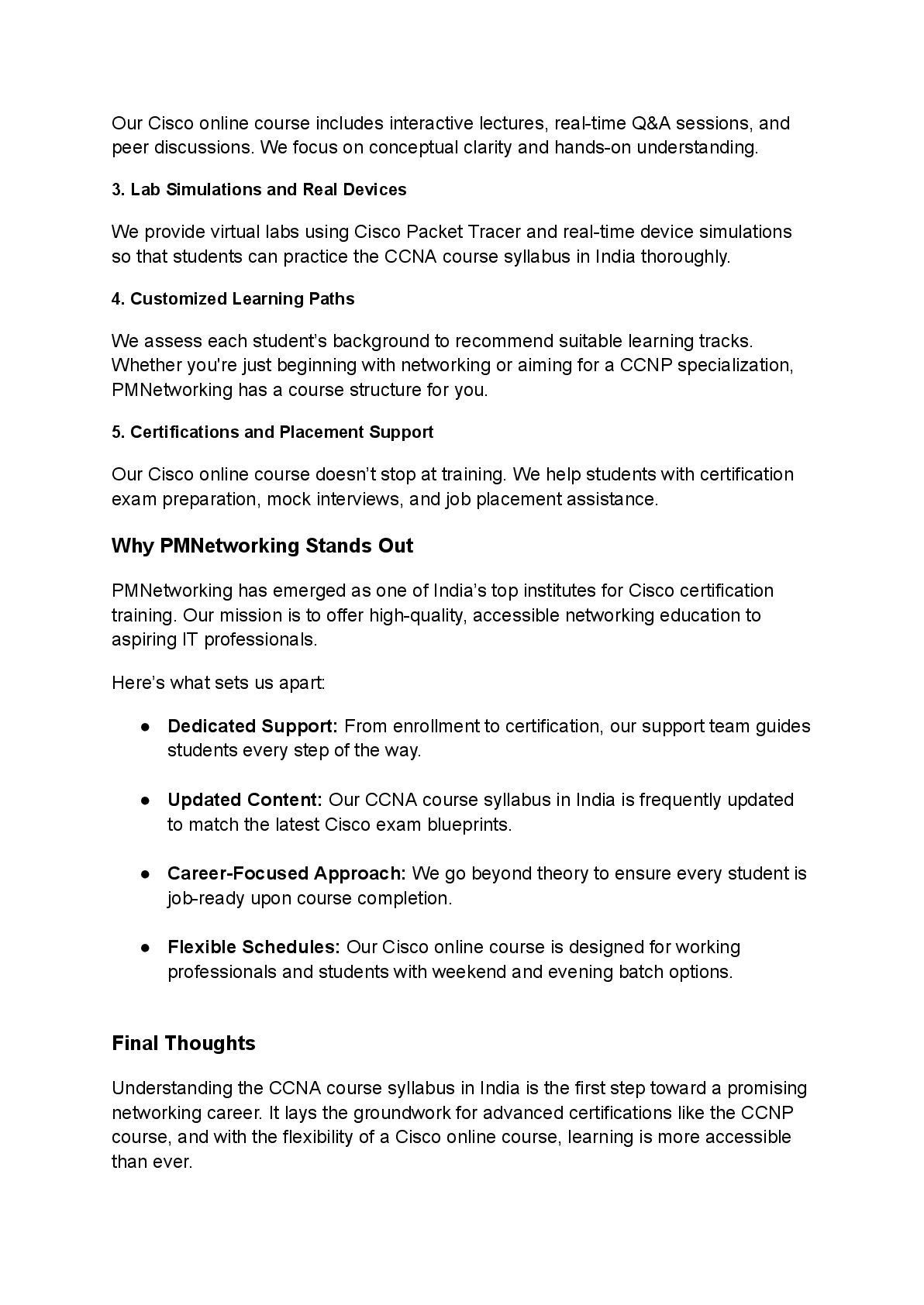 and peer discussions. We focus on conceptual clarity and hands-on understanding. 3. Lab Simulations and Real Devices We provide virtual labs using Cisco Packet Tracer and real-time device simulations so that students can practice the CCNA course syllabus in India thoroughly. 4. Customized Learning Paths We assess each student’s background to recommend suitable learning tracks. Whether you're just beginning with networking or aiming for a CCNP specialization, PMNetworking has a course structure for you. 5. Certifications and Placement Support Our Cisco online course doesn’t stop at training. We help students with certification exam preparation, mock interviews, and job placement assistance. Why PMNetworking Stands Out PMNetworking has emerged as one of India’s top institutes for Cisco certification training. Our mission is to offer high-quality, accessible networking education to aspiring IT professionals. Here’s what sets us apart: • Dedicated Support: From enrollment to certification, our support team guides students every step of the way. • Updated Content: Our CCNA course syllabus in India is frequently updated to match the latest Cisco exam blueprints. • Career-Focused Approach: We go beyond theory to ensure every student is job-ready upon course completion. • Flexible Schedules: Our Cisco online course is designed for working professionals and students with weekend and evening batch options. Final Thoughts Understanding the CCNA course syllabus in India is the first step toward a promising networking career. It lays the groundwork for advanced certifications like the CCNP course, and with the flexibility of a Cisco online course, learning is more accessible than ever.