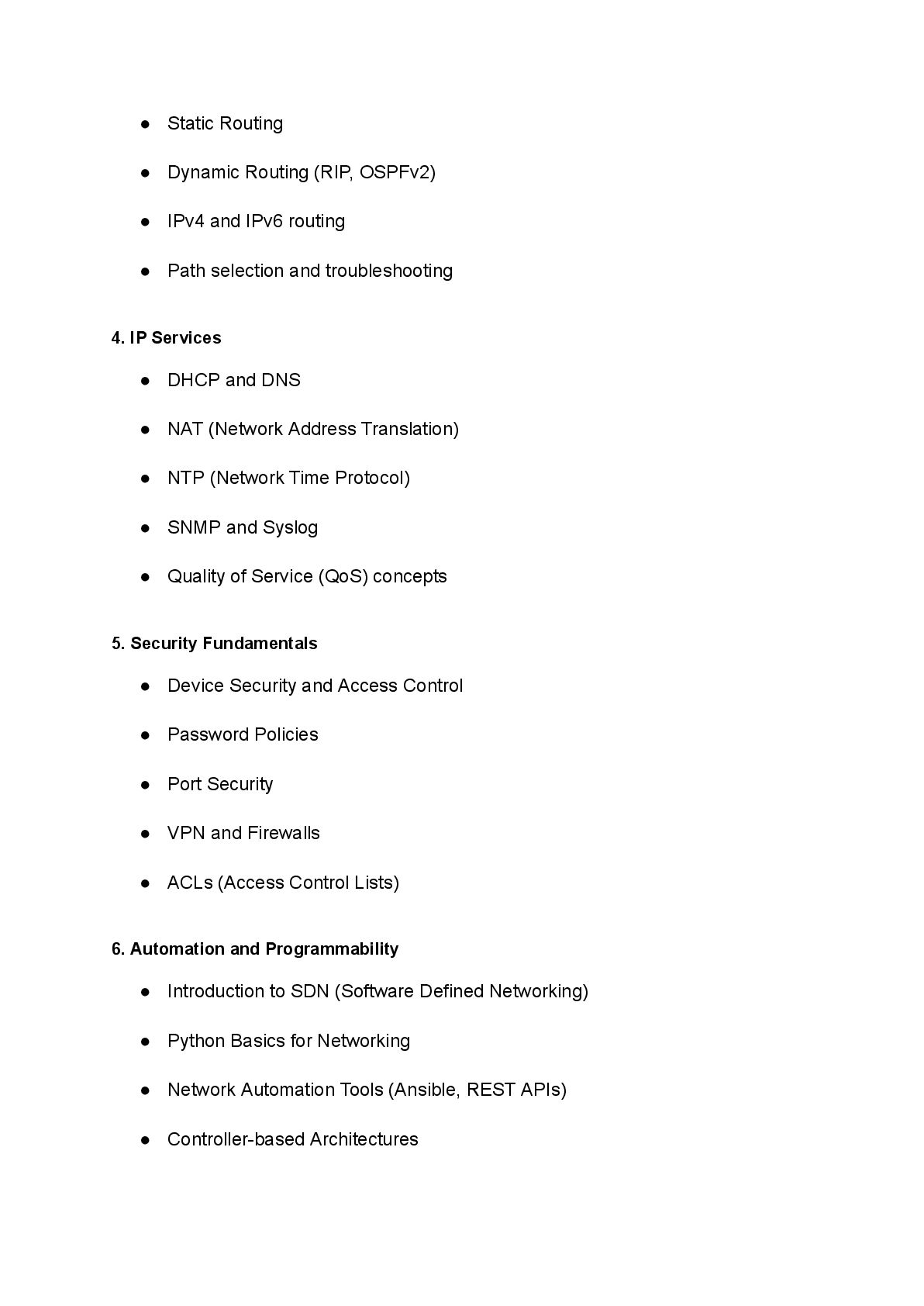and IPv6 routing • Path selection and troubleshooting 4. IP Services • DHCP and DNS • NAT (Network Address Translation) • NTP (Network Time Protocol) • SNMP and Syslog • Quality of Service (QoS) concepts 5. Security Fundamentals • Device Security and Access Control • Password Policies • Port Security • VPN and Firewalls • ACLs (Access Control Lists) 6. Automation and Programmability • Introduction to SDN (Software Defined Networking) • Python Basics for Networking • Network Automation Tools (Ansible, REST APIs) • Controller-based Architectures