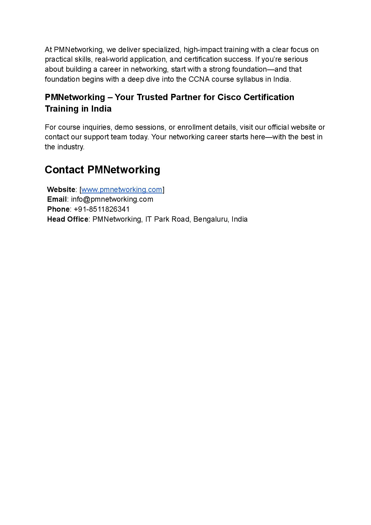 focus on practical skills, real-world application, and certification success. If you’re serious about building a career in networking, start with a strong foundation—and that foundation begins with a deep dive into the CCNA course syllabus in India. PMNetworking – Your Trusted Partner for Cisco Certification Training in India For course inquiries, demo sessions, or enrollment details, visit our official website or contact our support team today. Your networking career starts here—with the best in the industry. Contact PMNetworking Website: [www.pmnetworking.com] Email: [email protected] Phone: +91-8511826341 Head Office: PMNetworking, IT Park Road, Bengaluru, India
