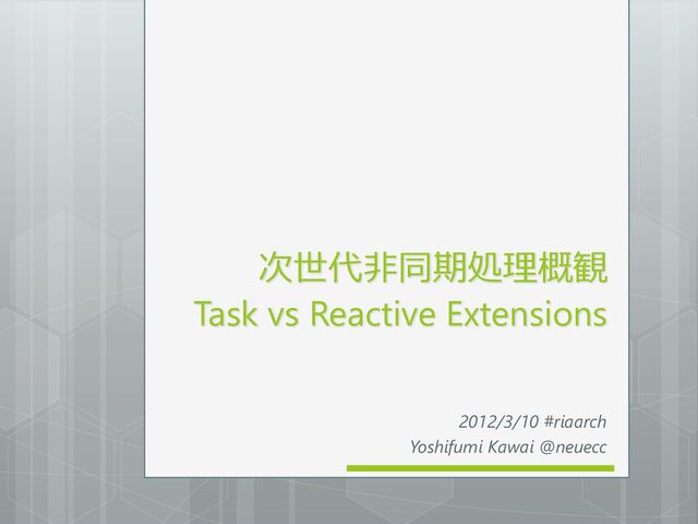 17.  Task vs RxだったらRxのほうが使いやすい  ただしC# 5.0ではTaskが圧倒的に使いやすい  じゃあ将来を見据えてTaskで作ったほうが……? 