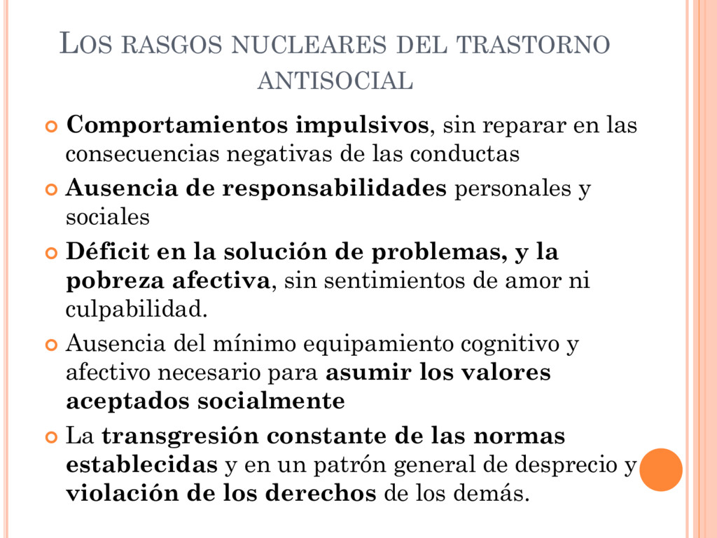 reparar en las consecuencias negativas de las conductas Ausencia de responsabilidades personales y sociales Déficit en la solución de problemas, y la pobreza afectiva, sin sentimientos de amor ni culpabilidad. Ausencia del mínimo equipamiento cognitivo y afectivo necesario para asumir los valores aceptados socialmente La transgresión constante de las normas establecidas y en un patrón general de desprecio y violación de los derechos de los demás.