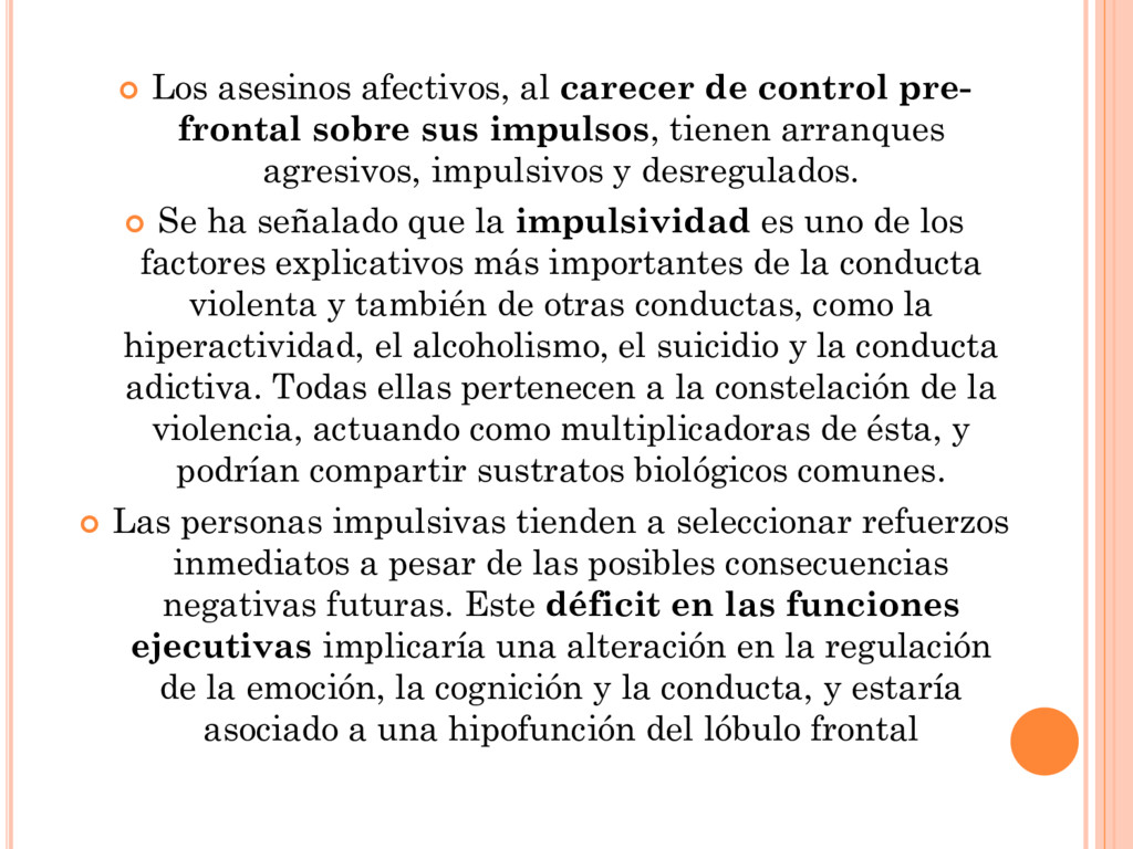 sobre sus impulsos, tienen arranques agresivos, impulsivos y desregulados. Se ha señalado que la impulsividad es uno de los factores explicativos más importantes de la conducta violenta y también de otras conductas, como la hiperactividad, el alcoholismo, el suicidio y la conducta adictiva. Todas ellas pertenecen a la constelación de la violencia, actuando como multiplicadoras de ésta, y podrían compartir sustratos biológicos comunes. Las personas impulsivas tienden a seleccionar refuerzos inmediatos a pesar de las posibles consecuencias negativas futuras. Este déficit en las funciones ejecutivas implicaría una alteración en la regulación de la emoción, la cognición y la conducta, y estaría asociado a una hipofunción del lóbulo frontal