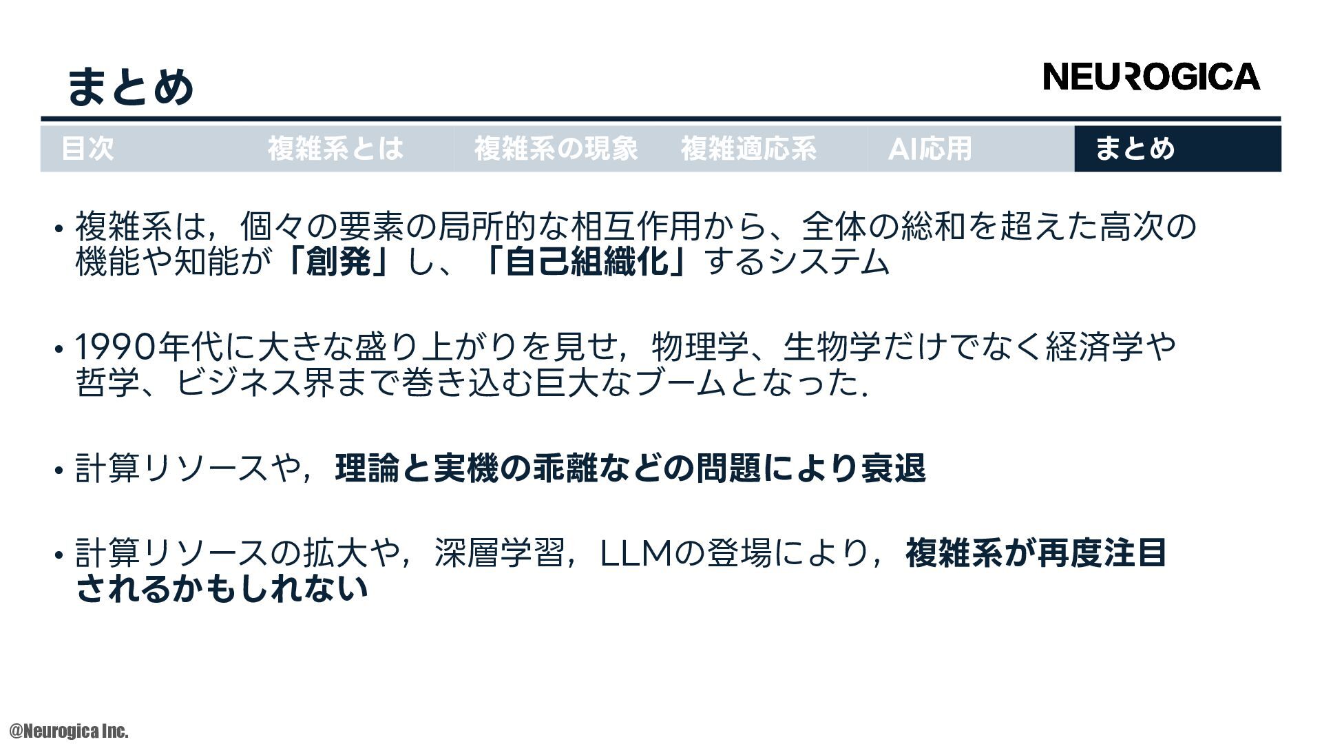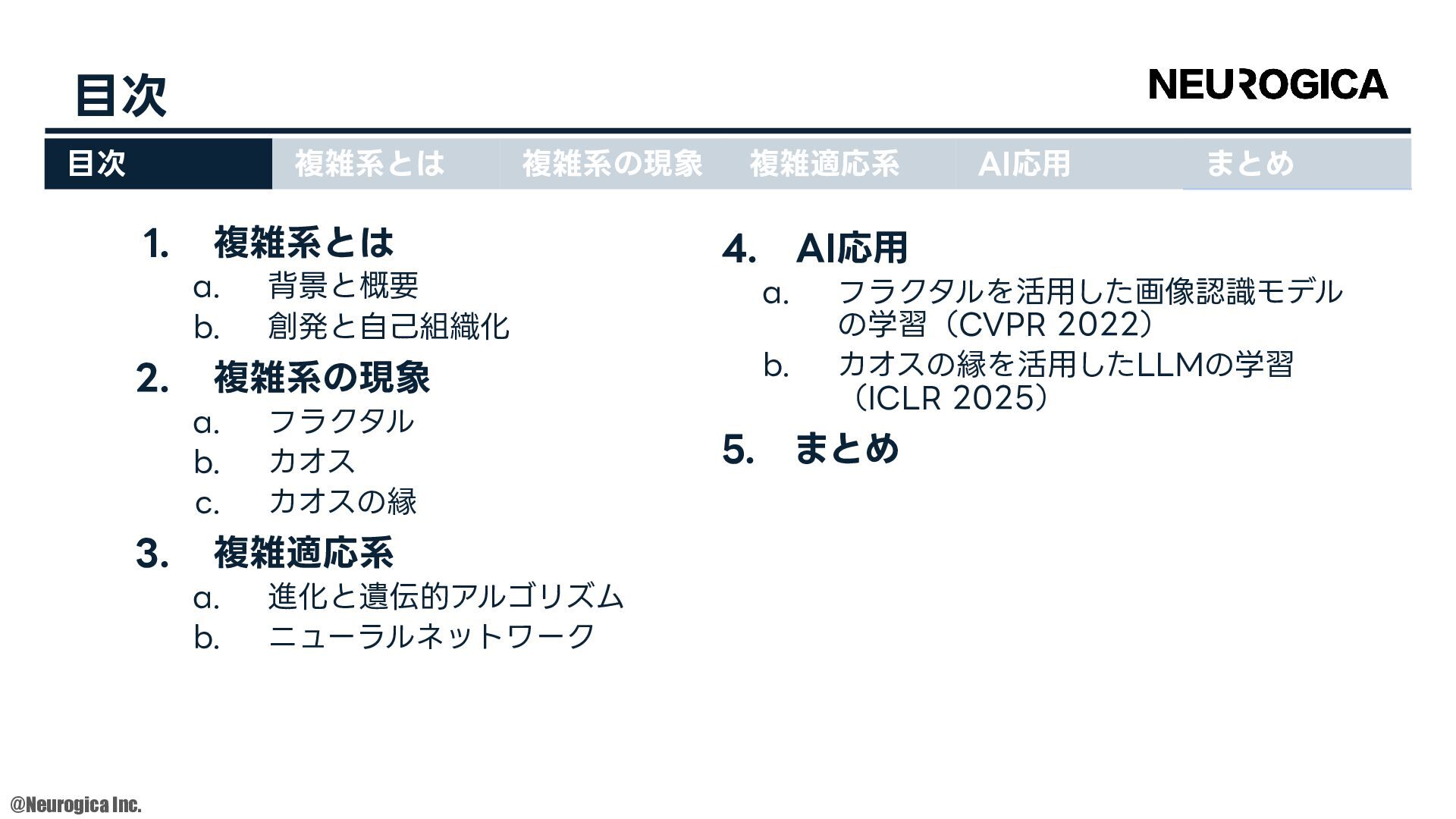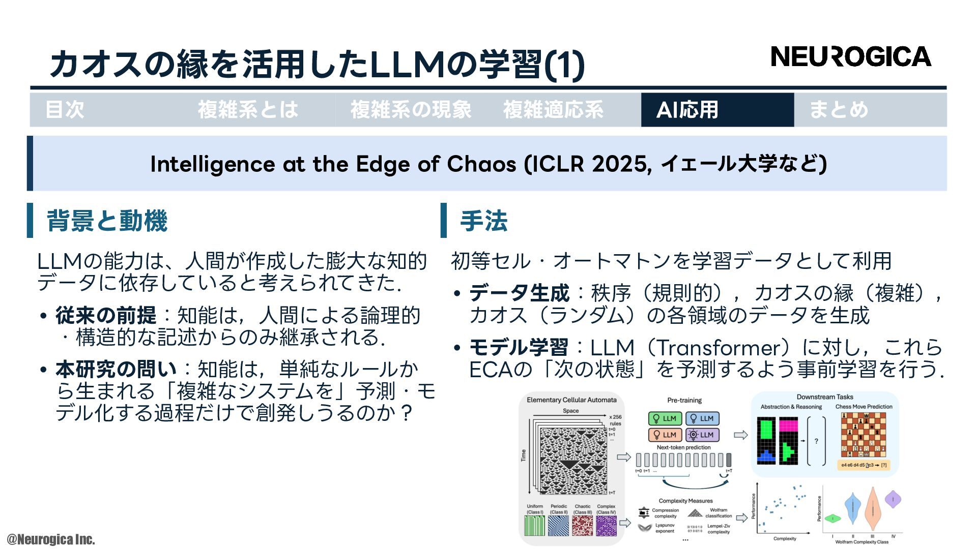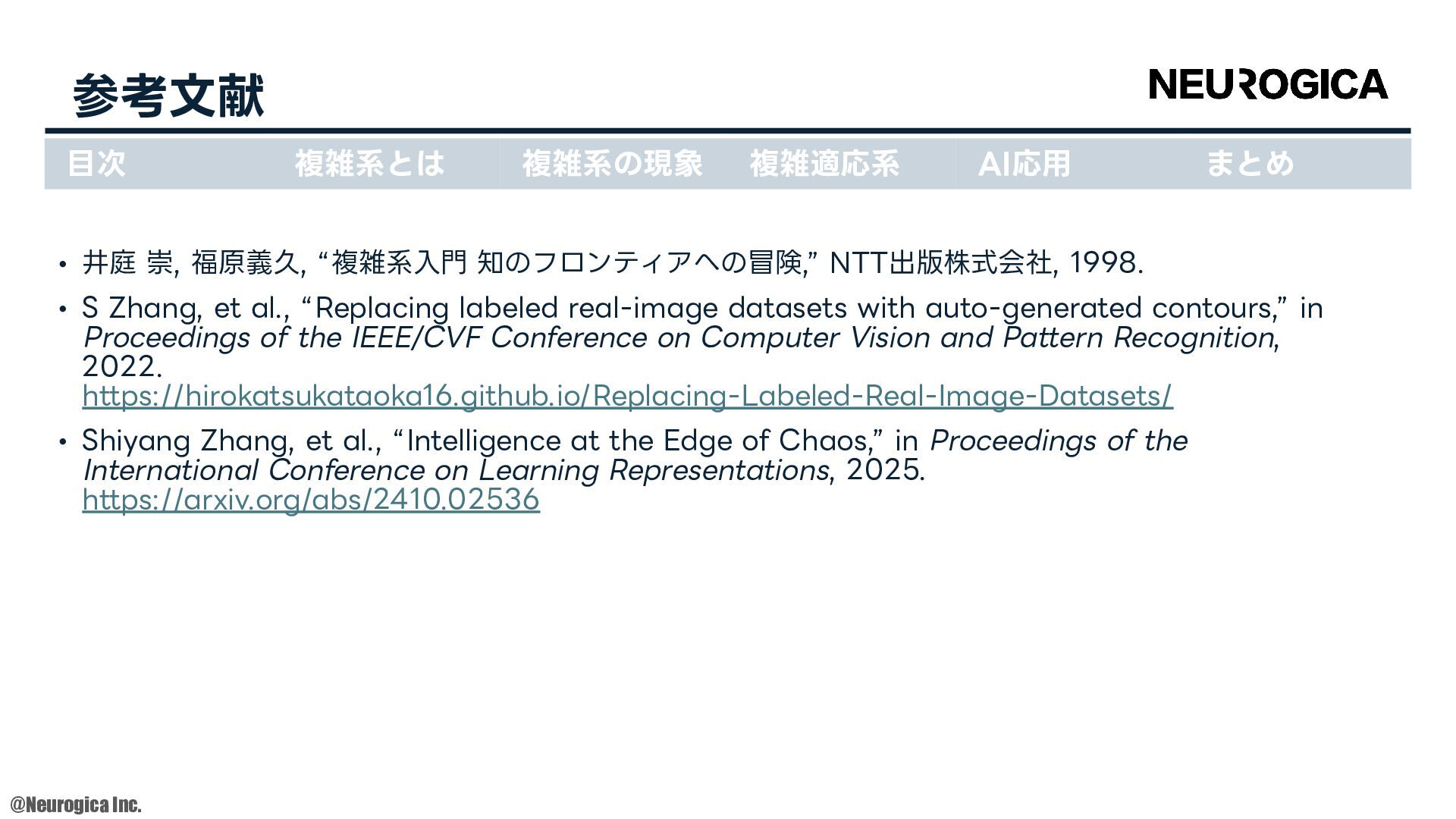 1998. • S Zhang, et al., “Replacing labeled real-image datasets with auto-generated contours,” in Proceedings of the IEEE/CVF Conference on Computer Vision and Pattern Recognition, 2022. https://hirokatsukataoka16.github.io/Replacing-Labeled-Real-Image-Datasets/ • Shiyang Zhang, et al., “Intelligence at the Edge of Chaos,” in Proceedings of the International Conference on Learning Representations, 2025. https://arxiv.org/abs/2410.02536 ⽬次 複雑系とは 複雑系の現象 複雑適応系 AI応⽤ まとめ
