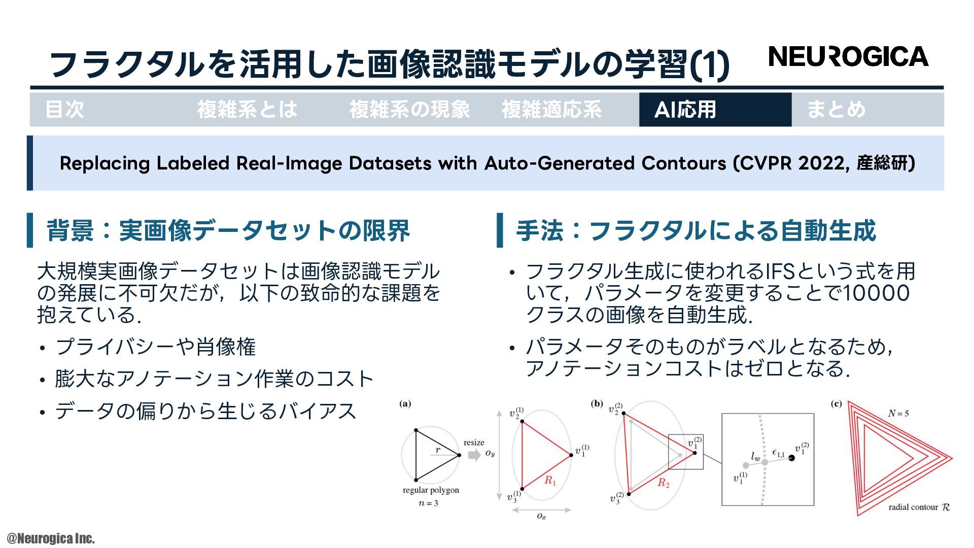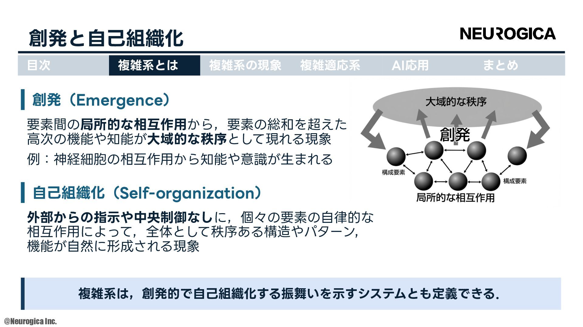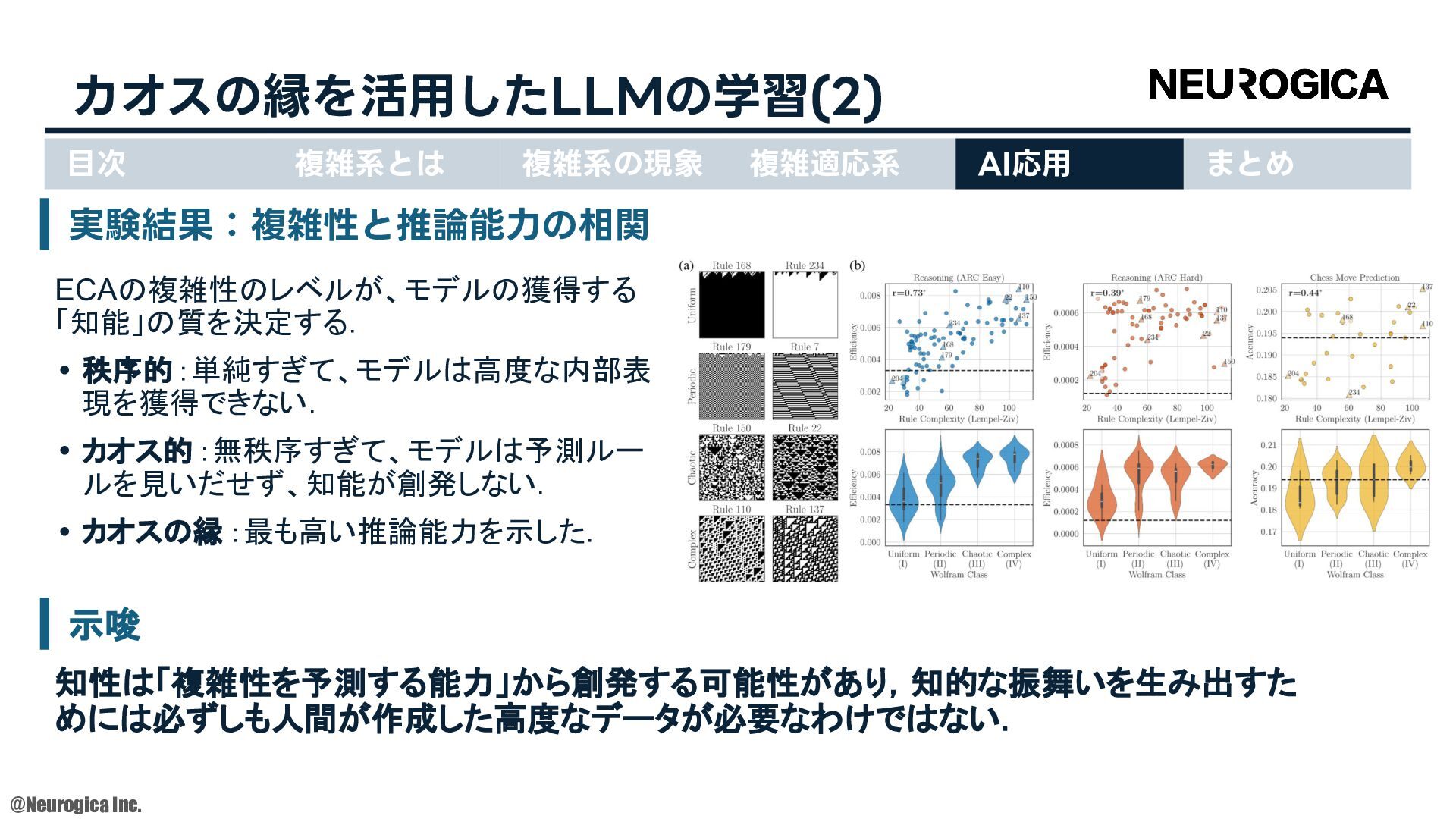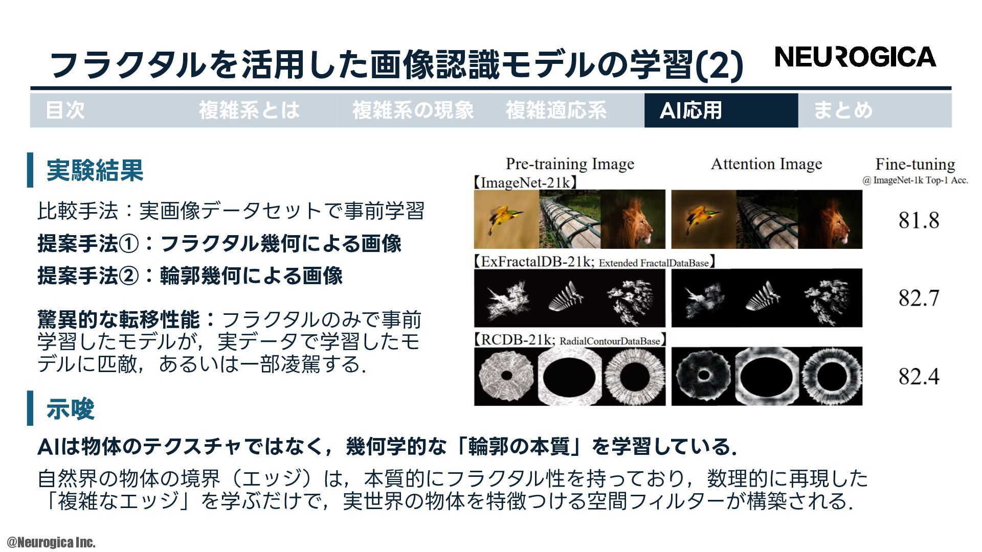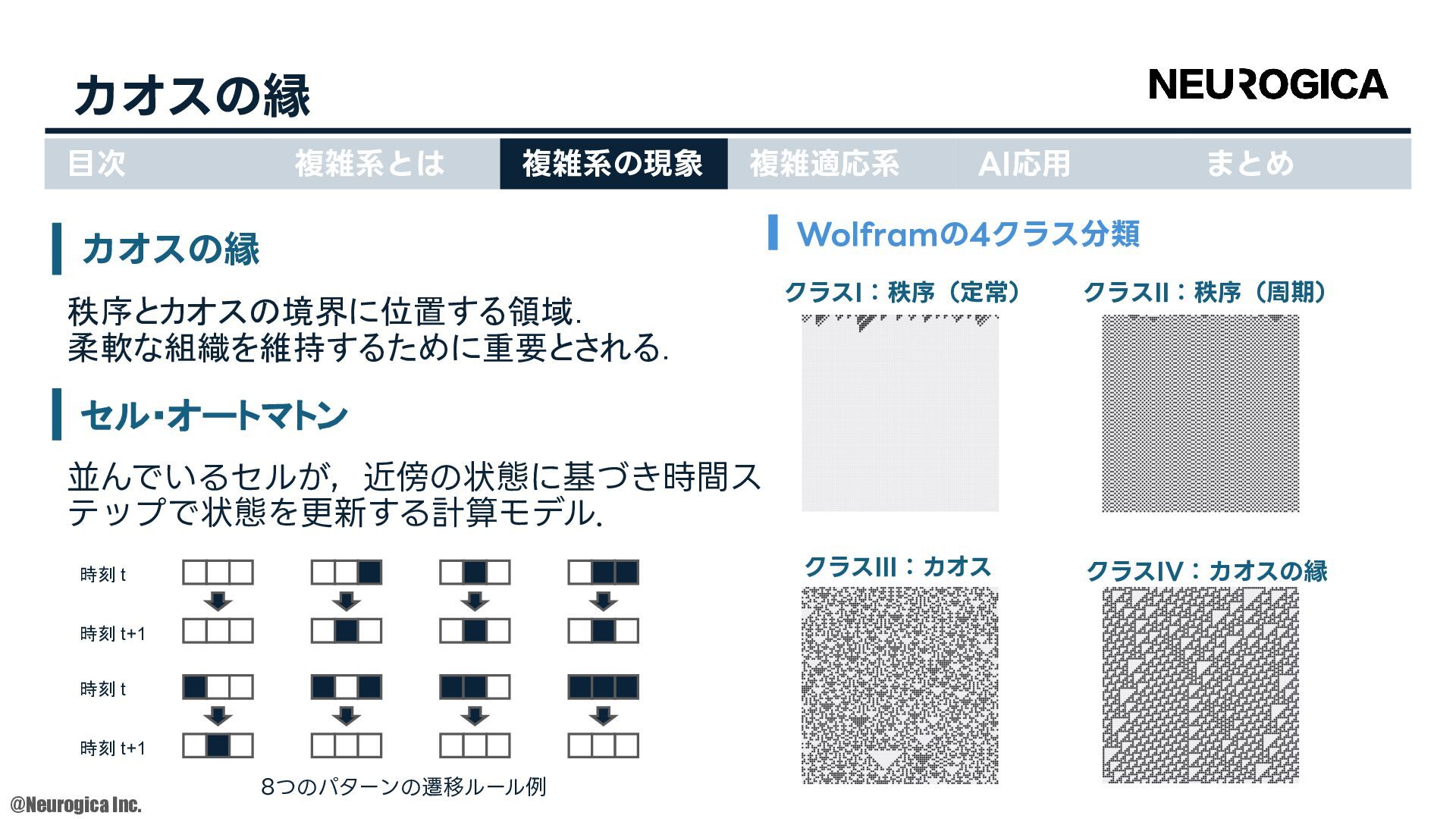 1998. • S Zhang, et al., “Replacing labeled real-image datasets with auto-generated contours,” in Proceedings of the IEEE/CVF Conference on Computer Vision and Pattern Recognition, 2022. https://hirokatsukataoka16.github.io/Replacing-Labeled-Real-Image-Datasets/ • Shiyang Zhang, et al., “Intelligence at the Edge of Chaos,” in Proceedings of the International Conference on Learning Representations, 2025. https://arxiv.org/abs/2410.02536 ⽬次 複雑系とは 複雑系の現象 複雑適応系 AI応⽤ まとめ