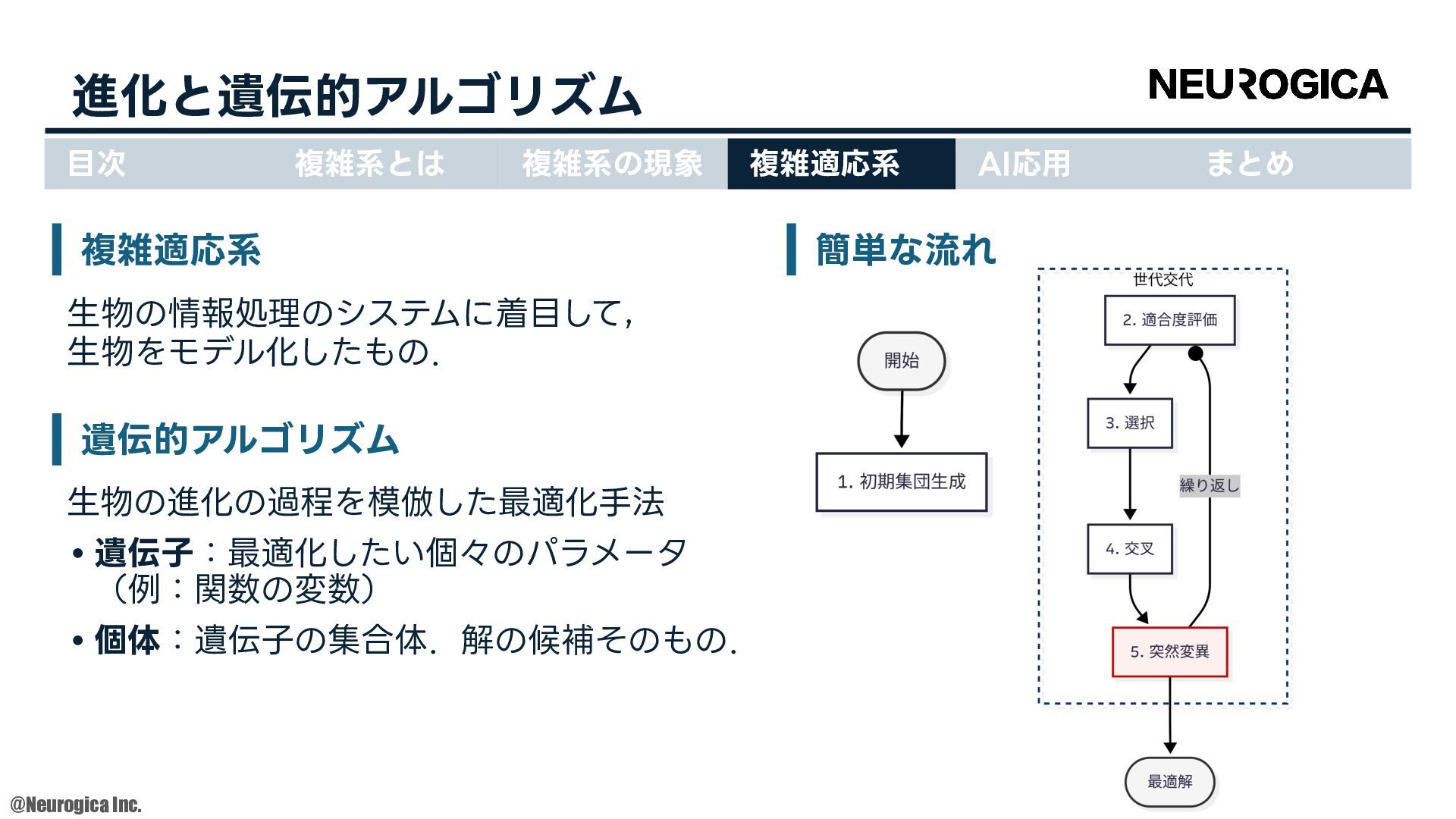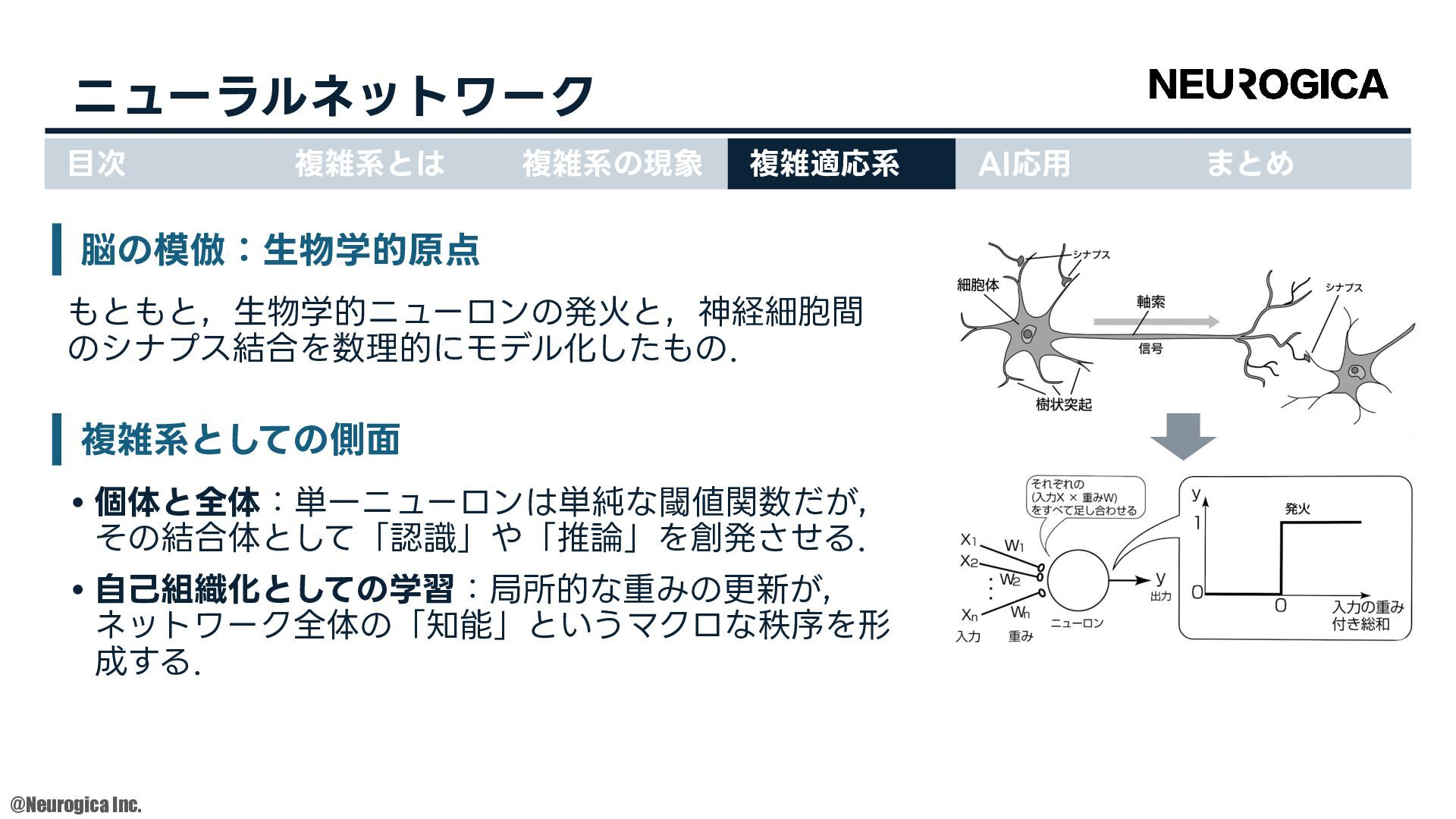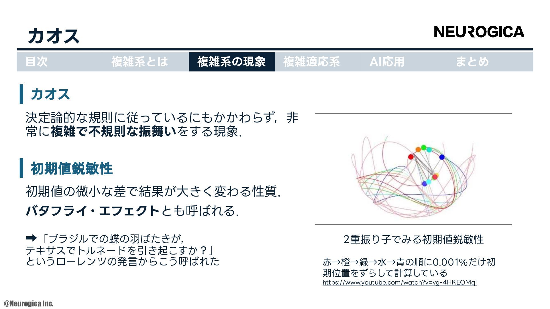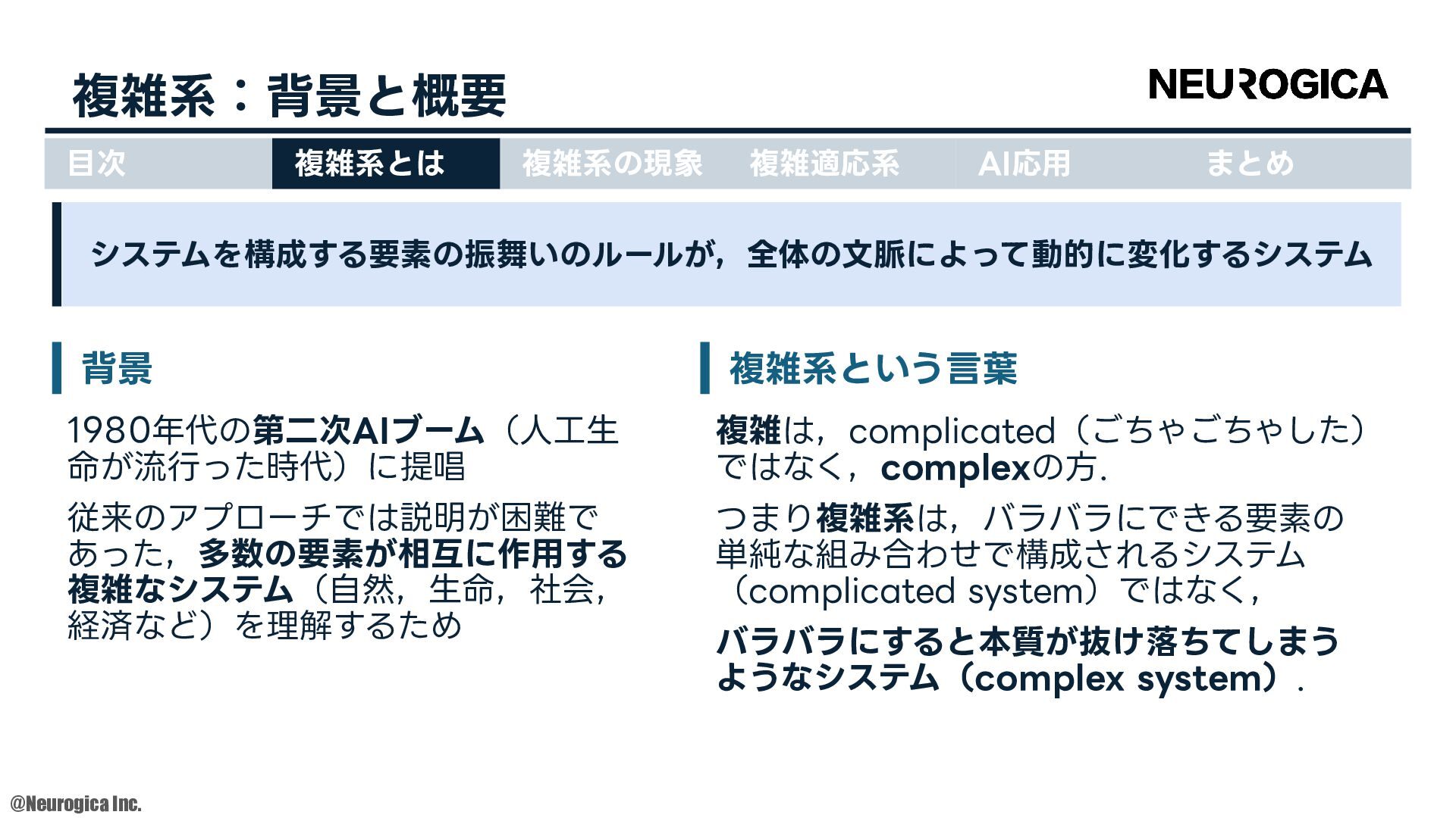 1998. • S Zhang, et al., “Replacing labeled real-image datasets with auto-generated contours,” in Proceedings of the IEEE/CVF Conference on Computer Vision and Pattern Recognition, 2022. https://hirokatsukataoka16.github.io/Replacing-Labeled-Real-Image-Datasets/ • Shiyang Zhang, et al., “Intelligence at the Edge of Chaos,” in Proceedings of the International Conference on Learning Representations, 2025. https://arxiv.org/abs/2410.02536 ⽬次 複雑系とは 複雑系の現象 複雑適応系 AI応⽤ まとめ