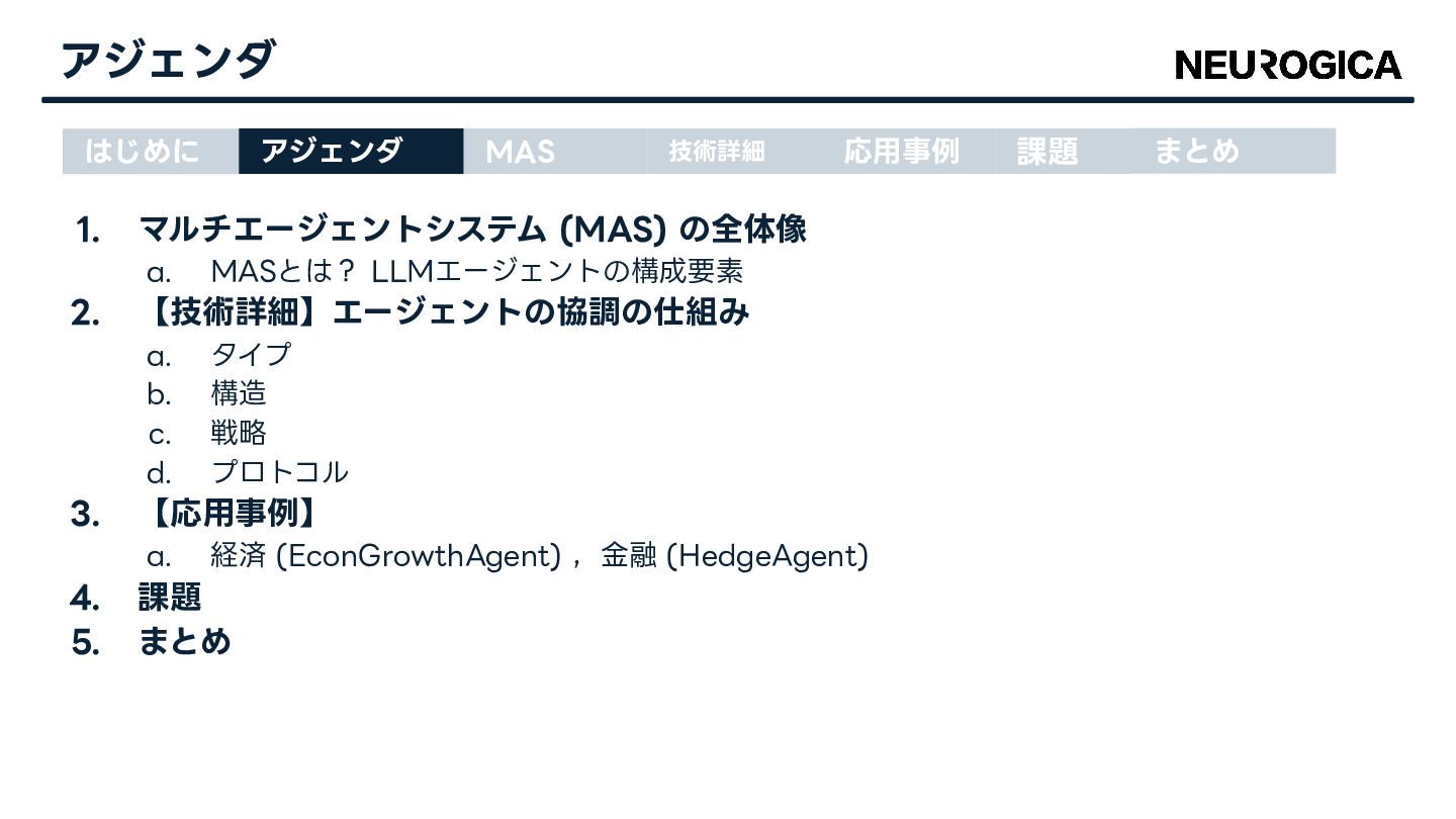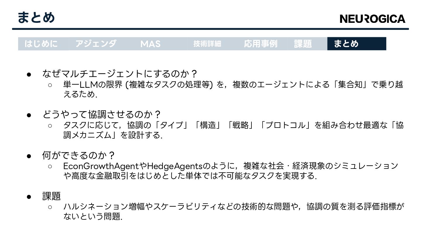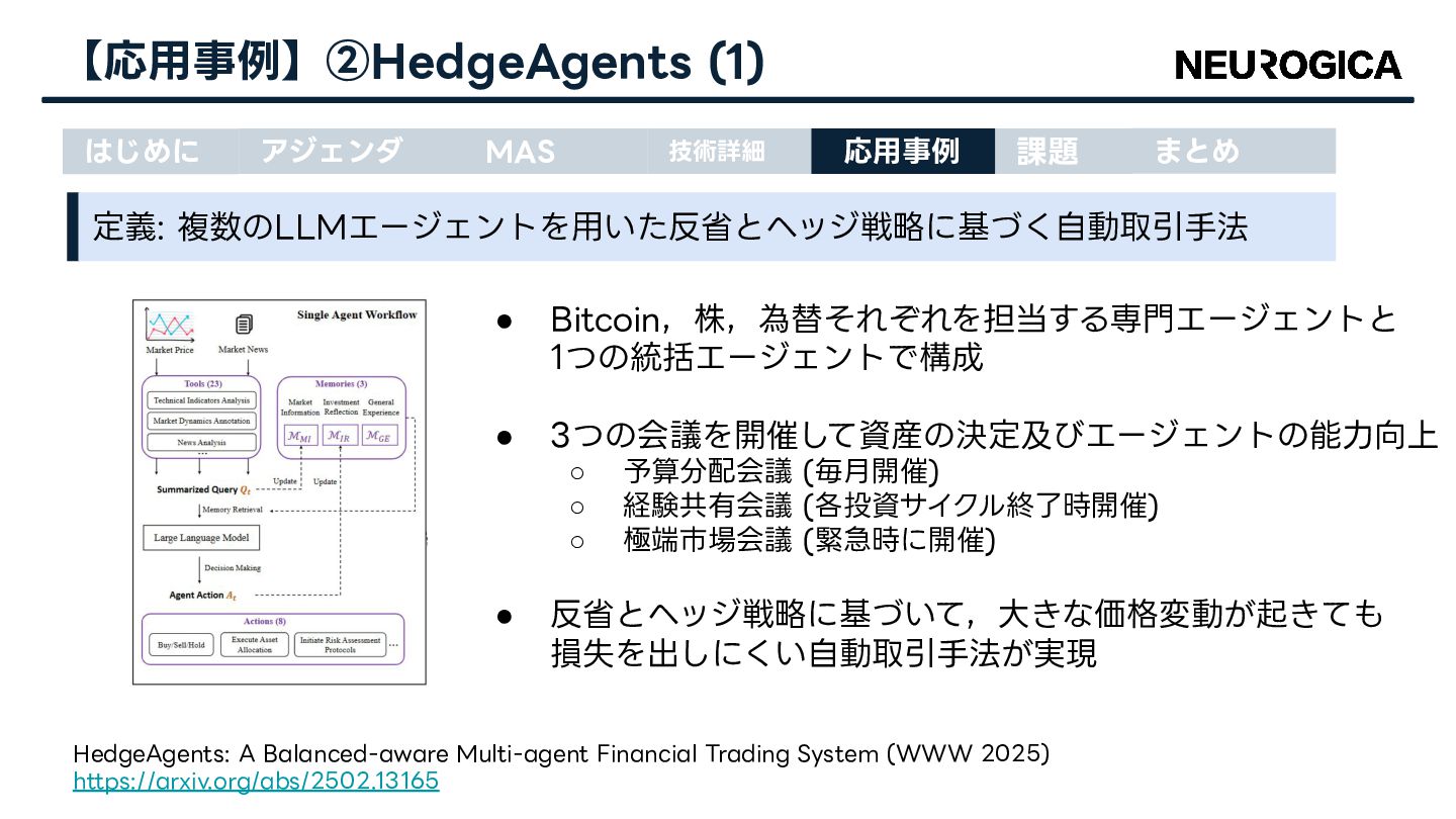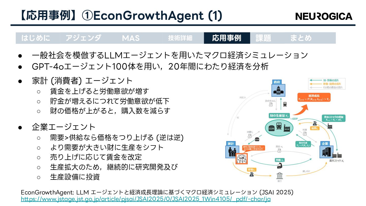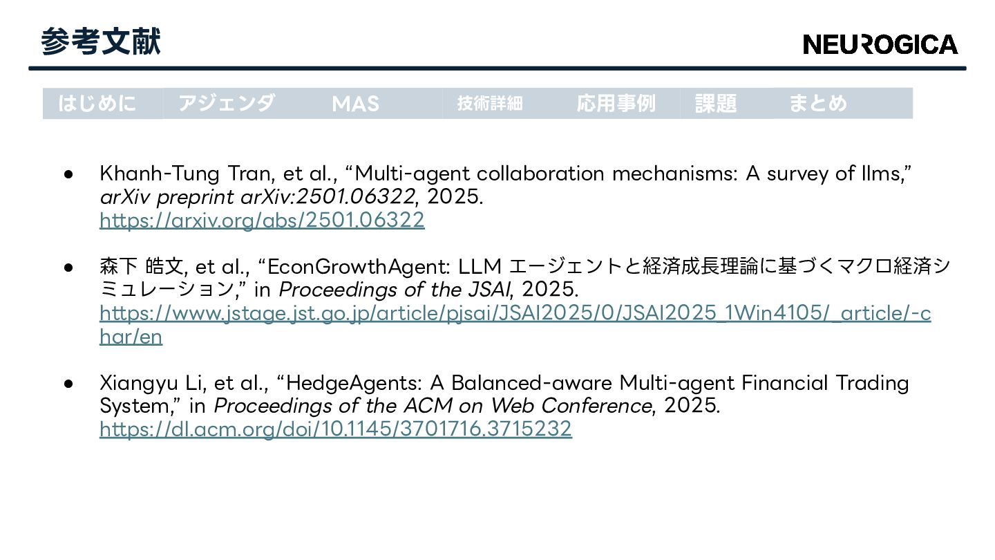 Tran, et al., “Multi-agent collaboration mechanisms: A survey of llms,” arXiv preprint arXiv:2501.06322, 2025. https://arxiv.org/abs/2501.06322 • 森下 皓⽂, et al., “EconGrowthAgent: LLM エージェントと経済成⻑理論に基づくマクロ経済シ ミュレーション,” in Proceedings of the JSAI, 2025. https://www.jstage.jst.go.jp/article/pjsai/JSAI2025/0/JSAI2025_1Win4105/_article/-c har/en • Xiangyu Li, et al., “HedgeAgents: A Balanced-aware Multi-agent Financial Trading System,” in Proceedings of the ACM on Web Conference, 2025. https://dl.acm.org/doi/10.1145/3701716.3715232