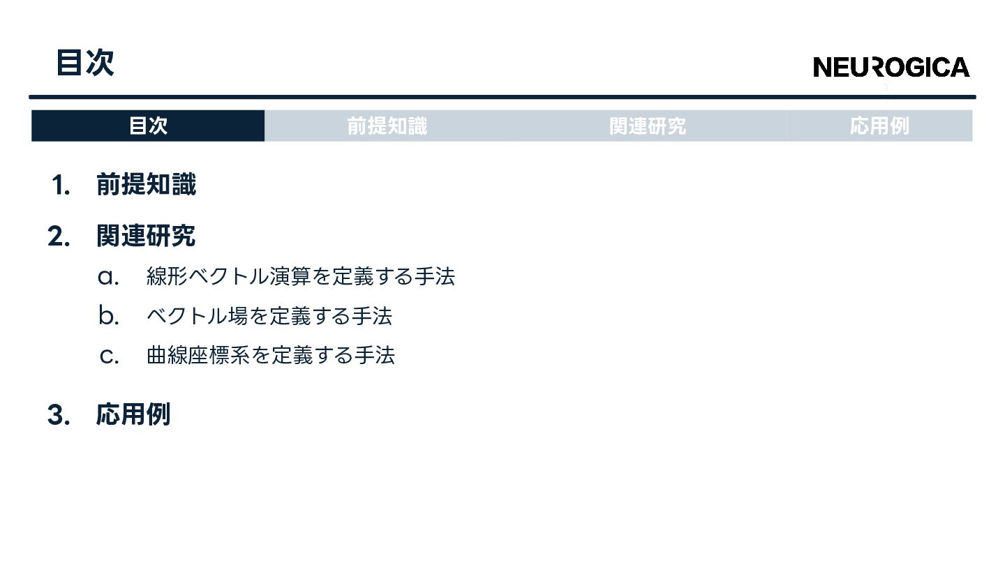 1. ⽬次 1. 前提知識 2. 関連研究 a. 線形ベクトル演算を定義する⼿法 b. ベクトル場を定義する⼿法 c.