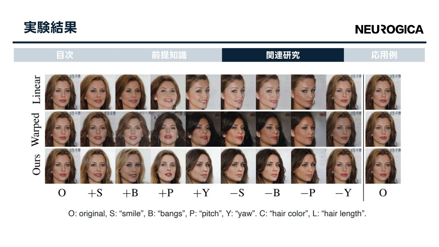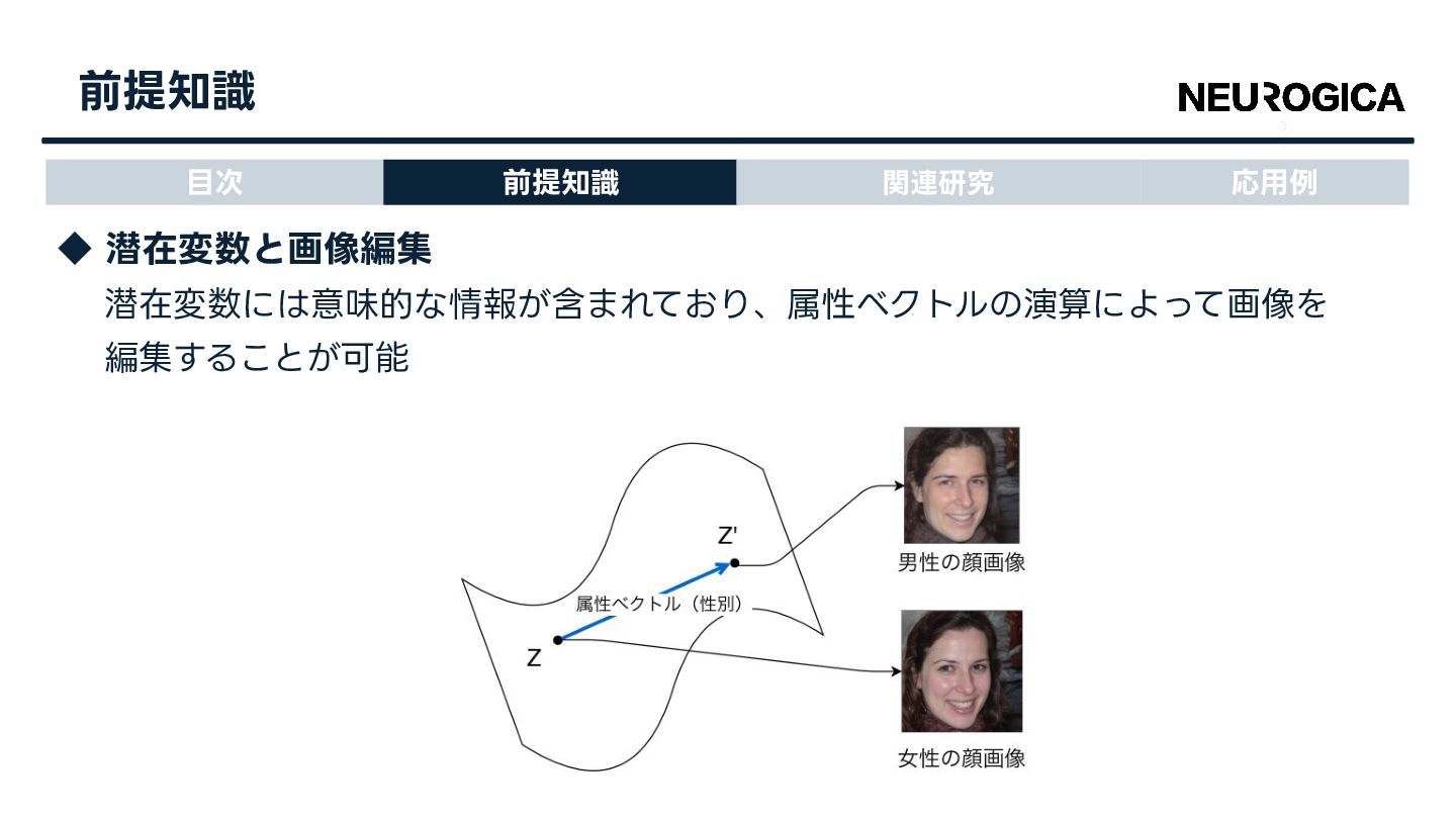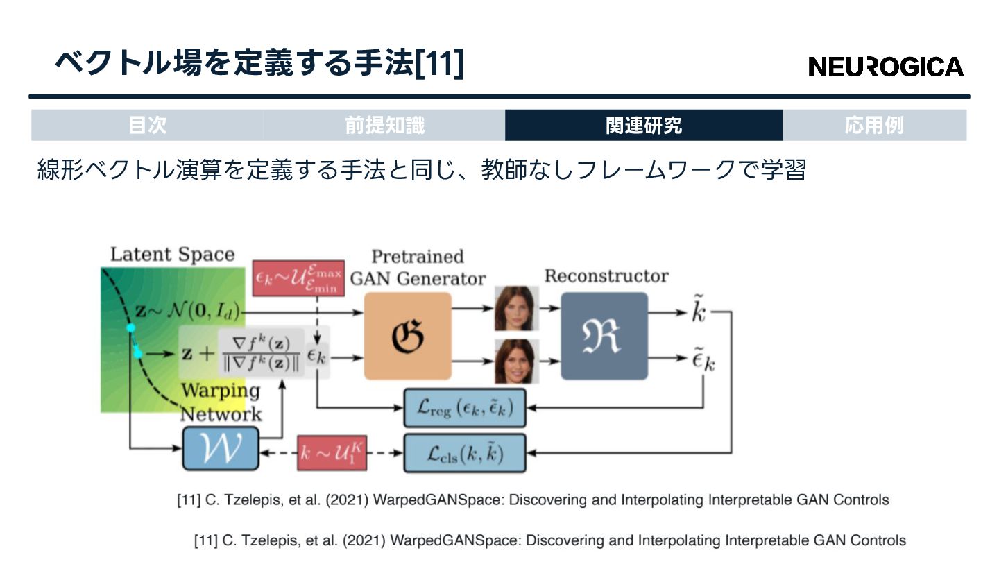 関連研究 応⽤例 これらの研究のやりたいことは、「⽣成モデルが獲得した潜在空間の構造の理解」