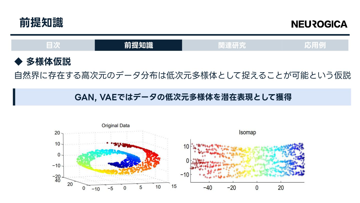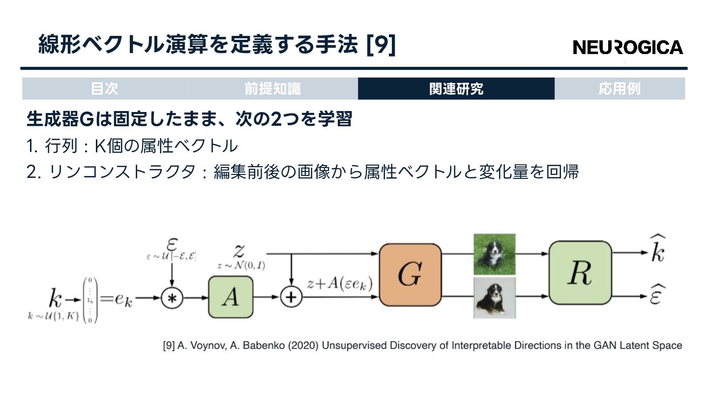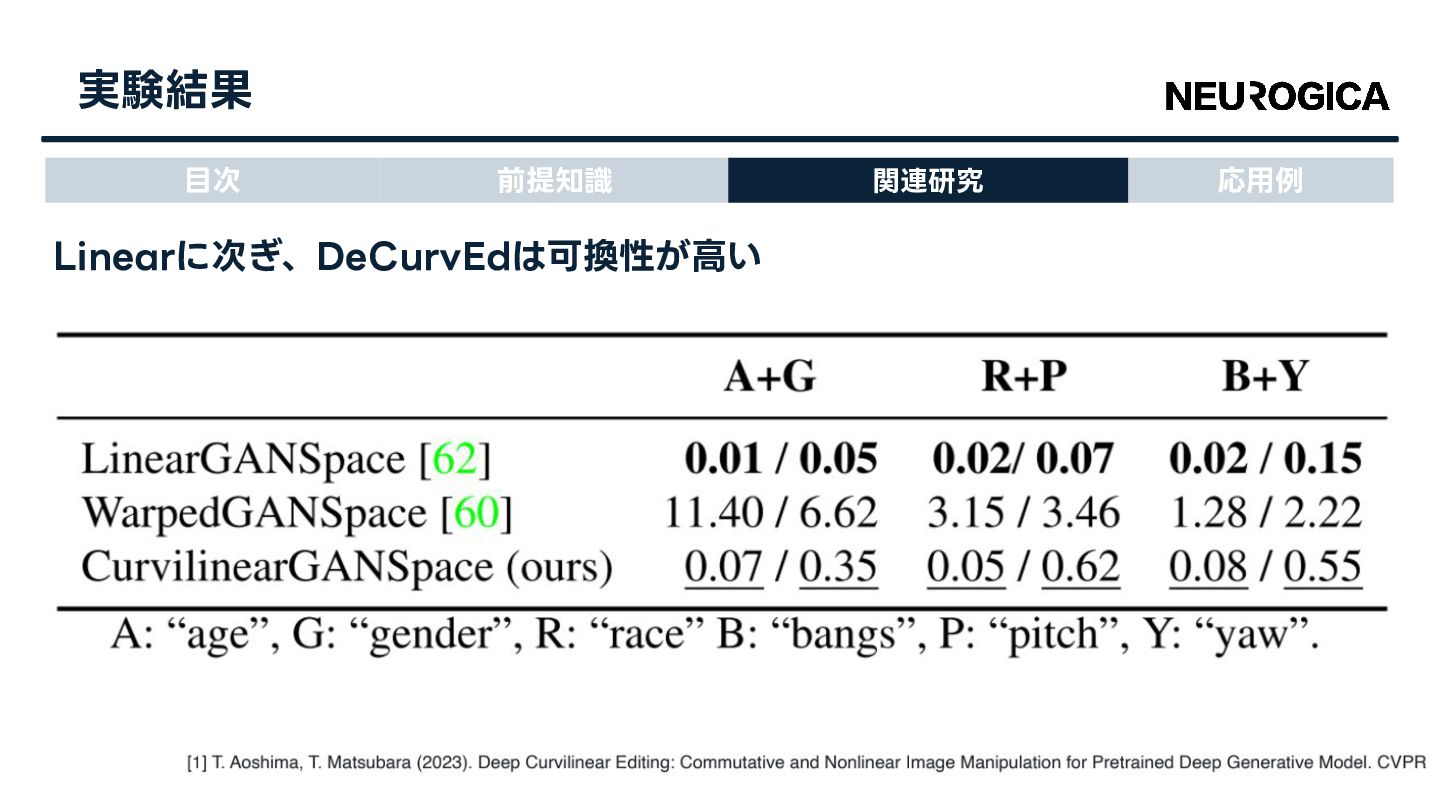 関連研究 応⽤例 これらの研究のやりたいことは、「⽣成モデルが獲得した潜在空間の構造の理解」