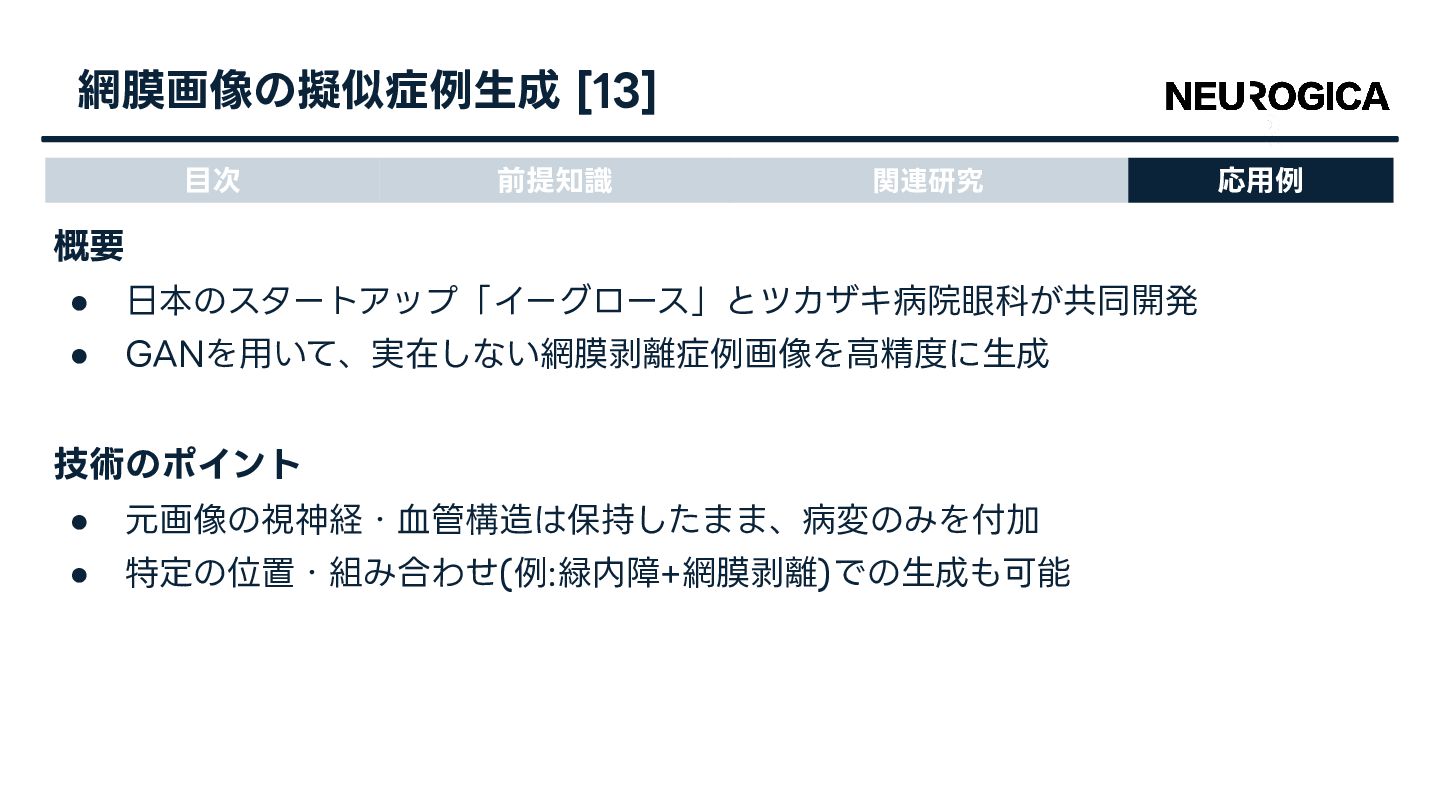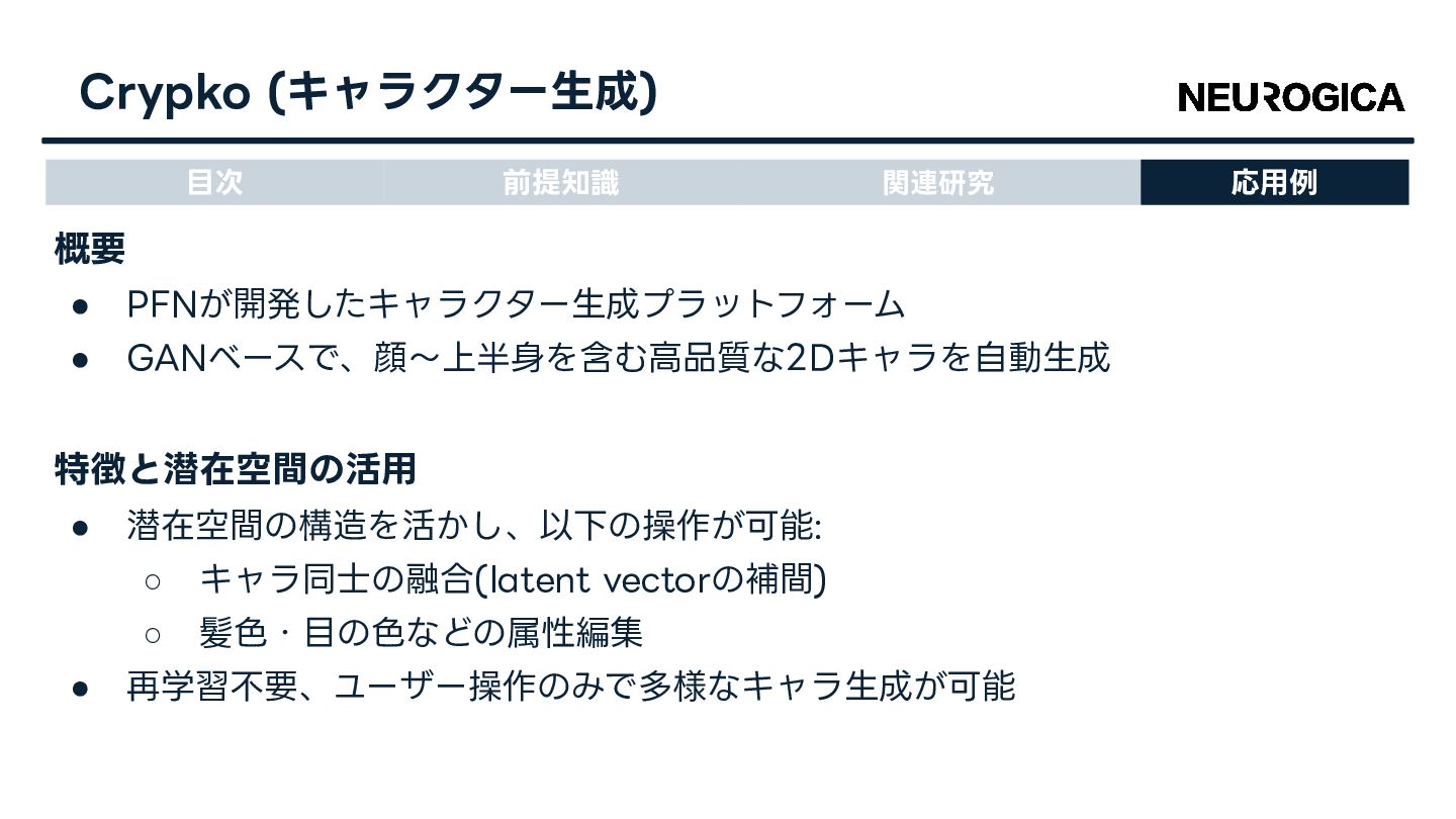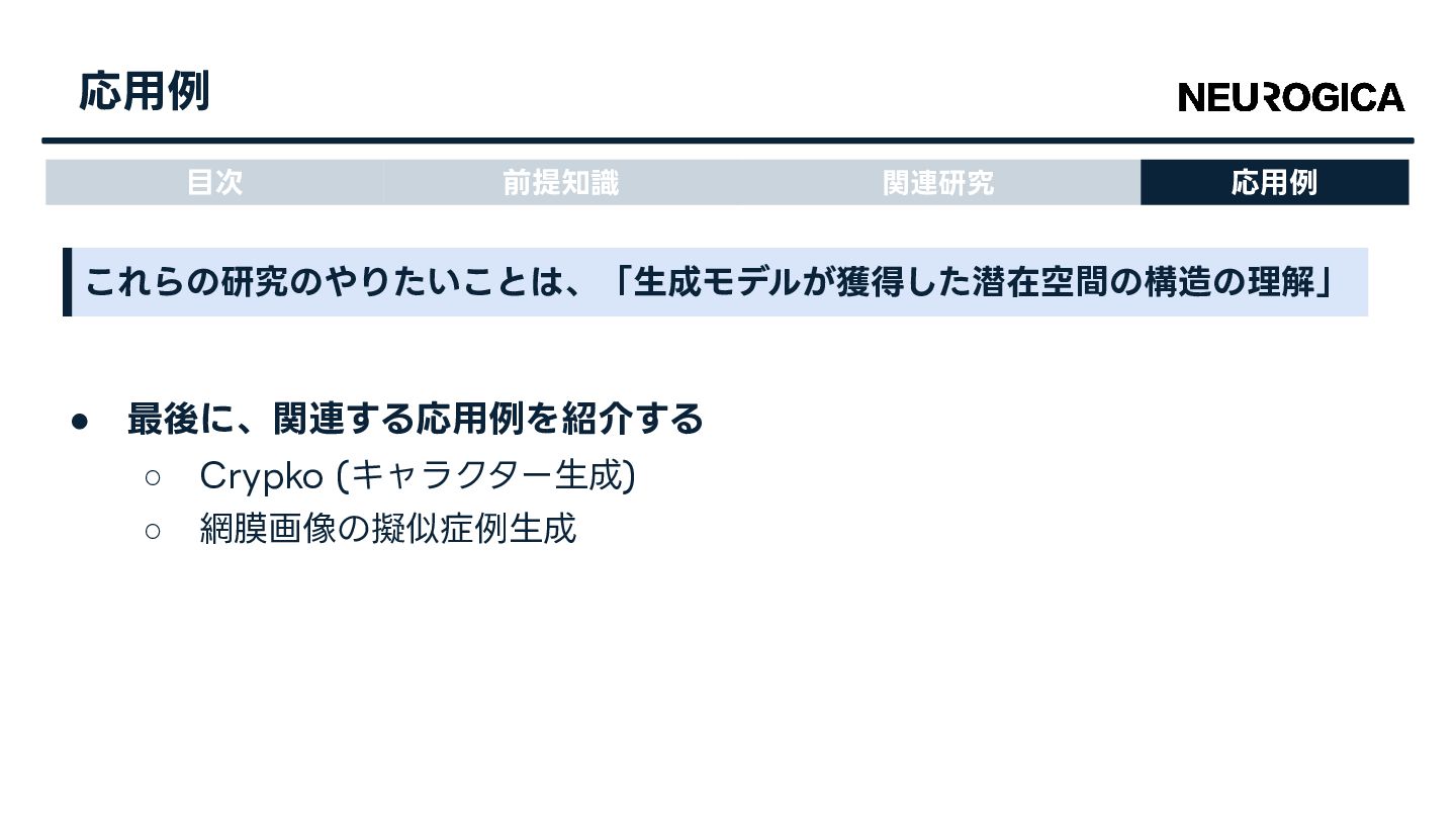 3. 応⽤例 • 最後に、関連する応⽤例を紹介する ◦ Crypko (キャラクター⽣成) ◦ 網膜画像の擬似症例⽣成 ⽬次 前提知識