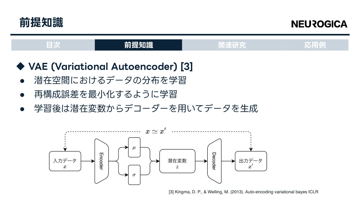 2. 前提知識 ◆ VAE (Variational Autoencoder) [3] • 潜在空間におけるデータの分布を学習 • 再構成誤差を最⼩化するように学習