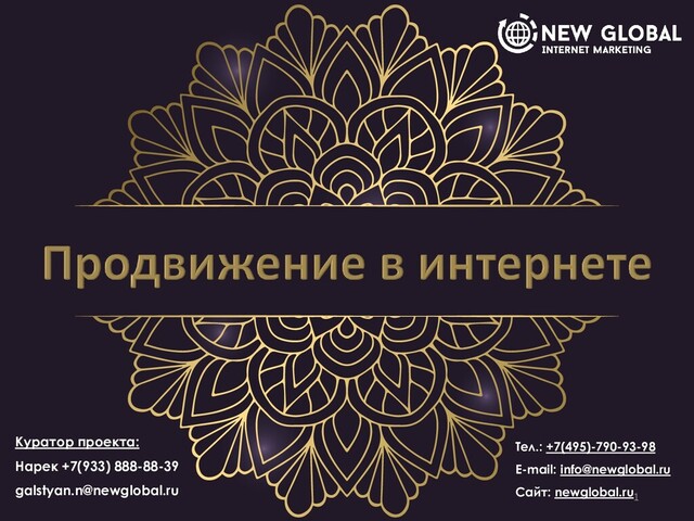 Мы - рекламное агентство New Global, ориентированное на клиента и его результат. В нашей работе используем комплексный подход для разработки рекламной кампании как в интернете, так и вне его поля. Разработка и реализация единой маркетинговой стратегии, ведет к выполнению поставленной цели и успешному решению намеченных задач с сохранением результатов в долгосрочной перспективе. New Global – это открытая компания, для которой важно внести свой вклад в развитие рынка, а потому наш подход – это качественная реализация всех поставленных задач, а не только демонстрация успешности отдельной рекламной кампании. Наши ценности: открытость; честность; качество; работа на результат; профессионализм . Миссия: Мы не просто «работаем», мы добиваемся успеха клиента, как своего. Мы - команда New Global. Команда New Global